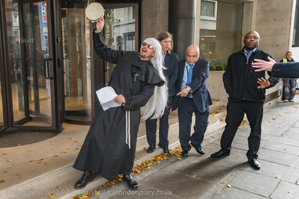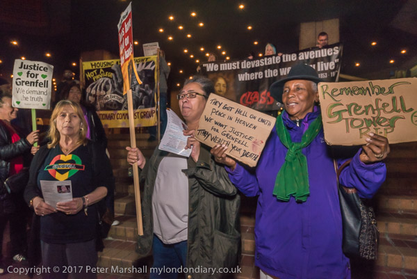 Class War protested with others outside the Royal Borough of Kensington & Chelsea council meeting taking place on the exact 100th anniversary of the storming of the Winter Palace by anarchist red guards at the start of the Russian revolution.