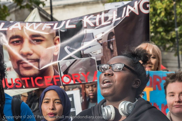 The slow march was followed by a rally opposite Downing St with speakers from many of the bereaved families, including those of Kingsley Burrell, Sean Rigg and Olaseni Lewis. Unlike in previous years the UFFC had decided not to send a delegation to deliver a letter to Downing St, as the response to previous letters, including last year to Theresa May have resulted in bland assurances but no action.