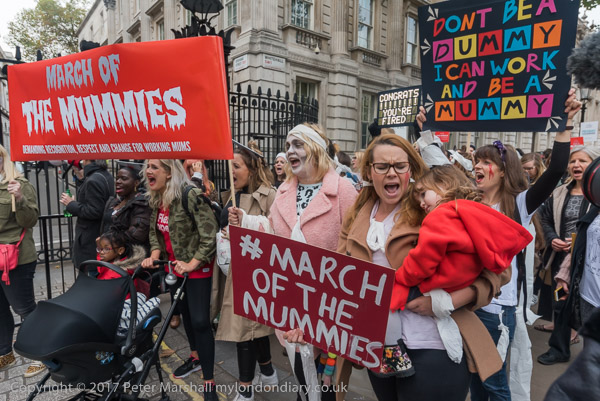 Campaign group Pregnant Then Screwed march from Trafalgar Square to a rally in Parliament Square London with women wrapped in bandages as mummies, many pushing buggies or carrying young children, calling for action over pregnancy and maternity discrimination after a government commissioned report showed that every year 54,000 women, 1 in 9 of those who get pregnant get sacked.