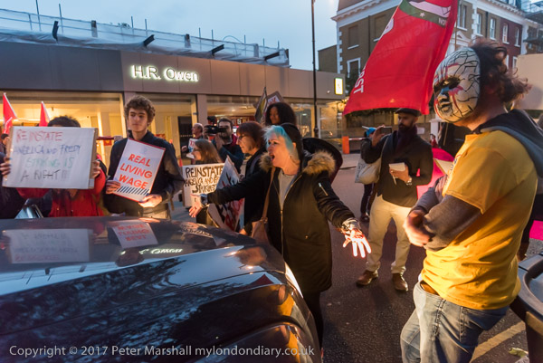 United Voices of the World trade union protest noisily and block the road outside the Ferrari showrooms of luxury car dealer H R Owen in South Kensington in protest called at short notice after a five hour grievance and disciplinary hearing yesterday in which the employers gave suspended cleaners Angelica Valencia and Freddy Lopez the choice - promise not to strike at Ferrari and accept your poverty wage, or find work elsewhere.