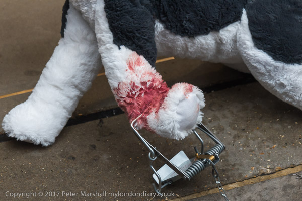 Canada Goose Cruelty - a coyote caught in a trap, possibly suffering
