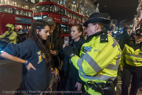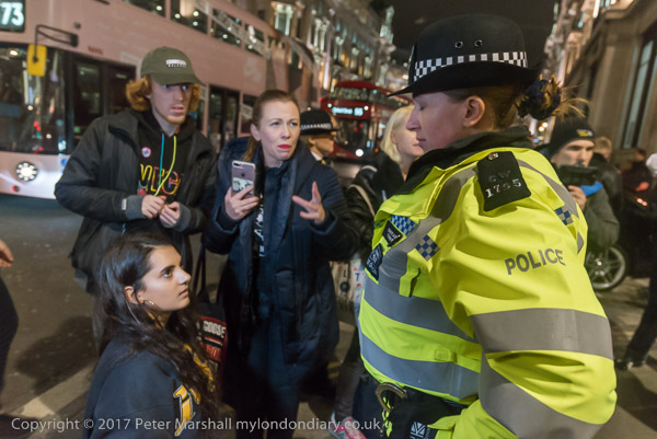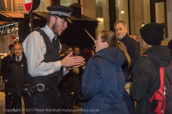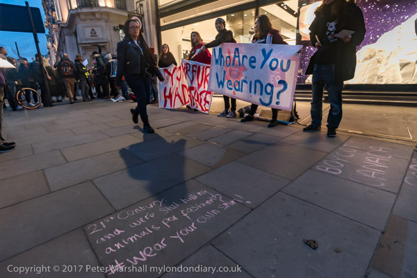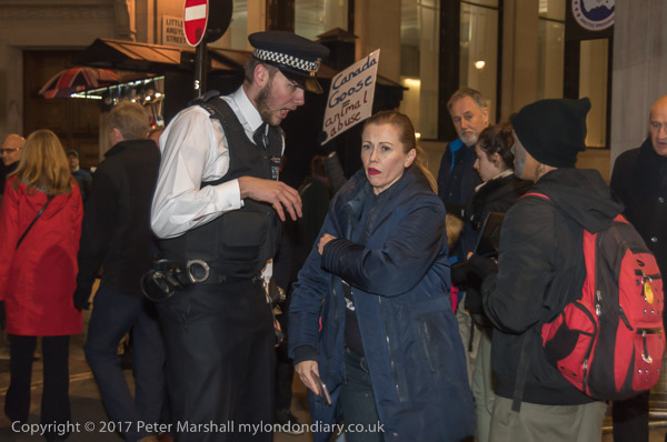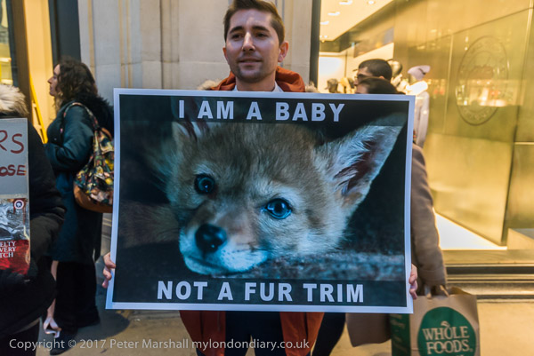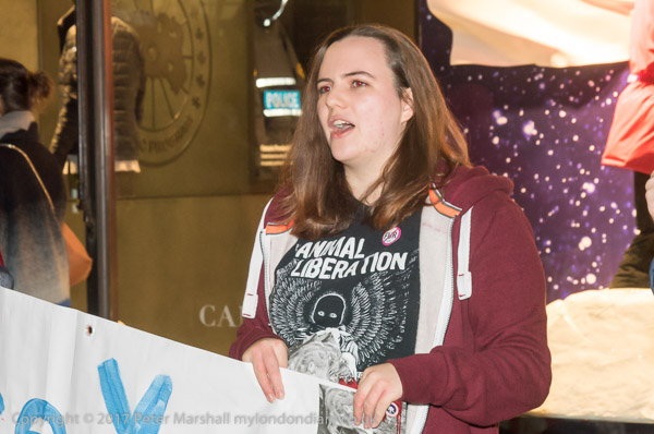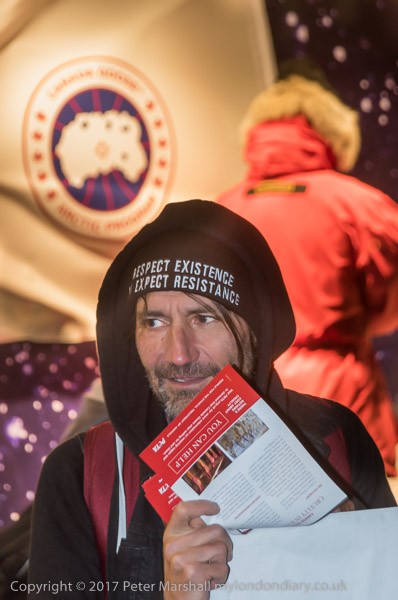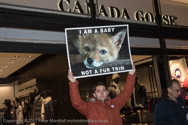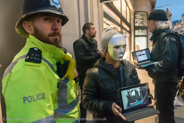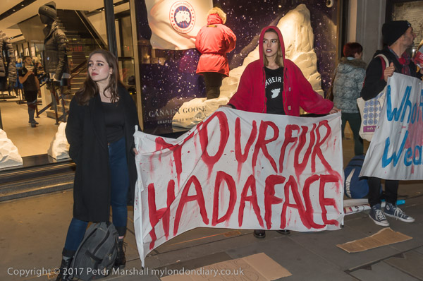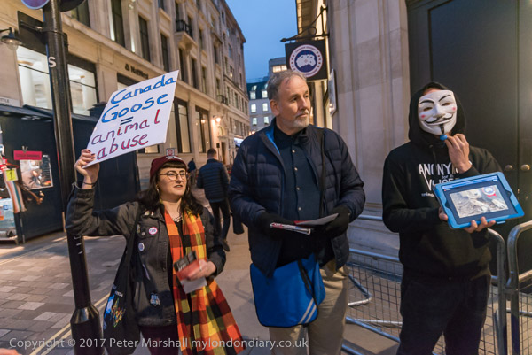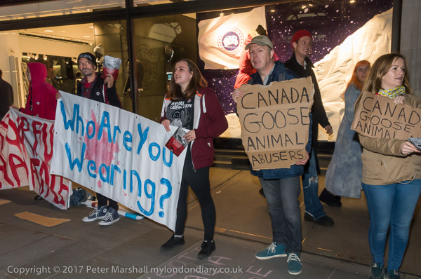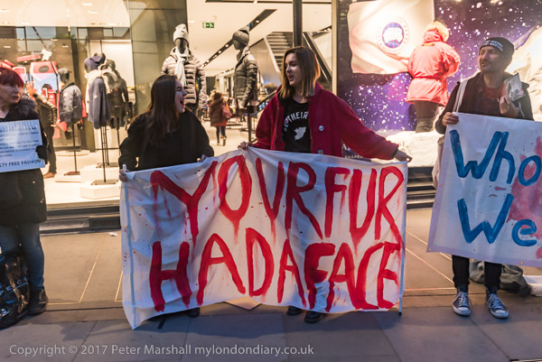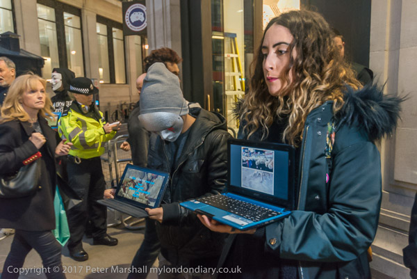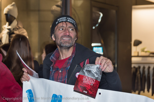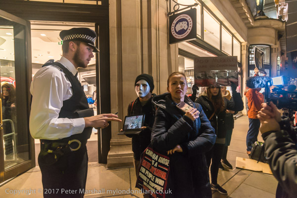 and another interferes with one of the protesters at the shop entrance