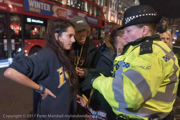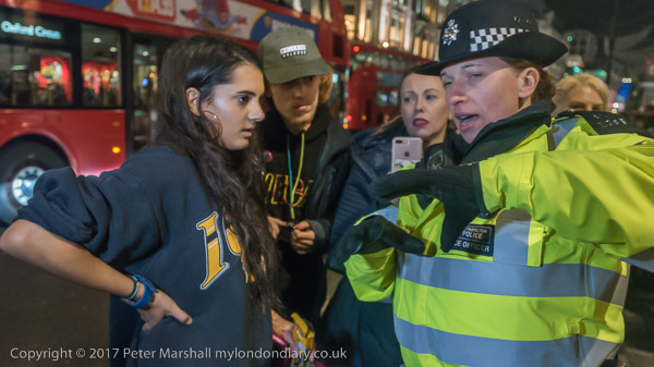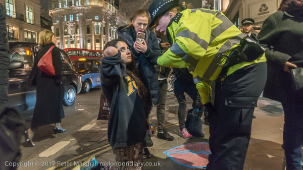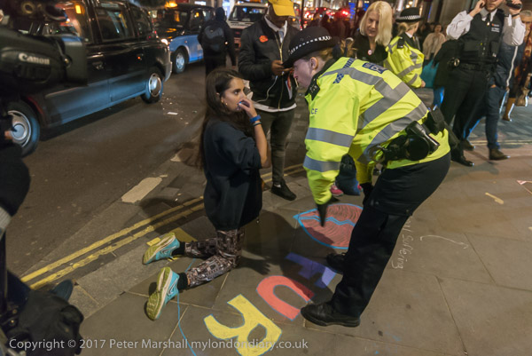 A police officer harasses a woman who is drawing on the pavement