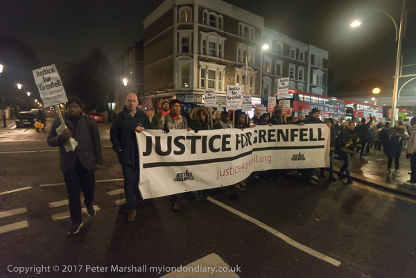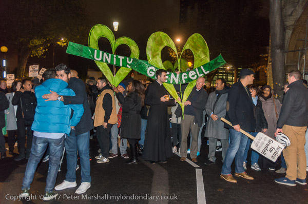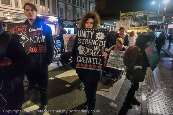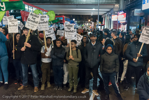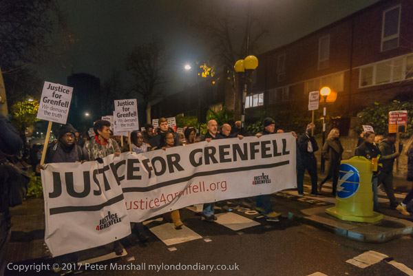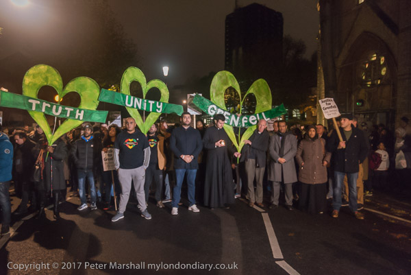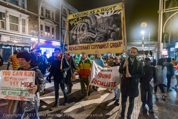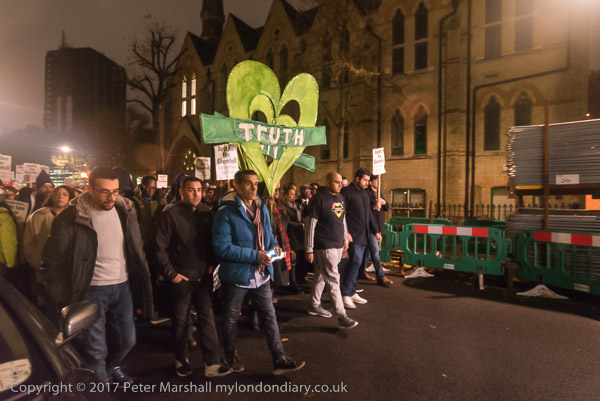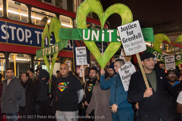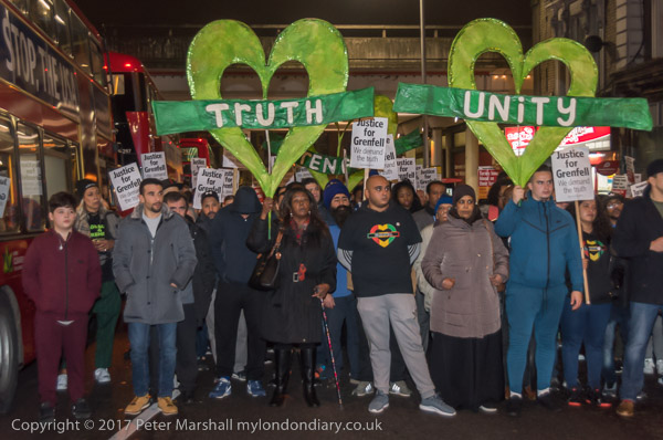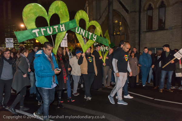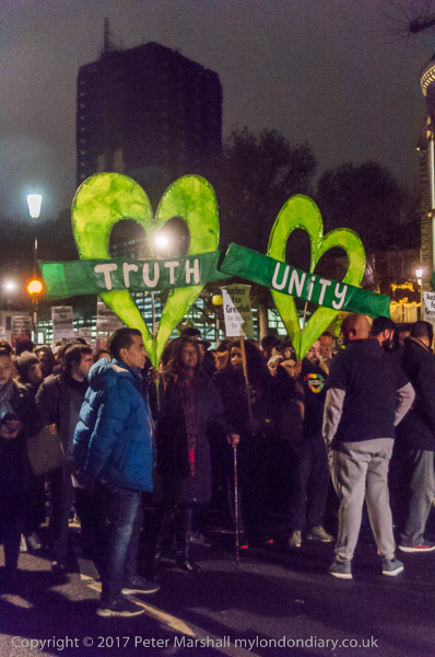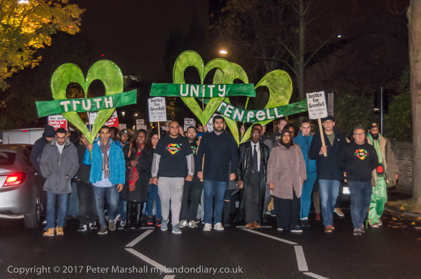 The burnt out shell of Grenfell Tower looms behind the marchers as