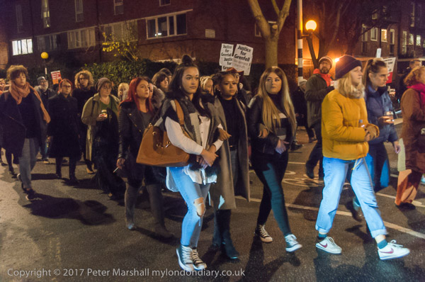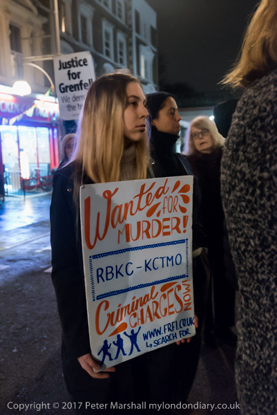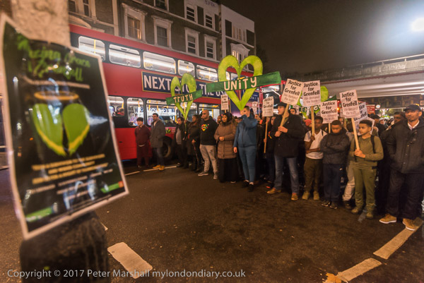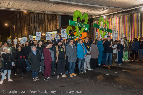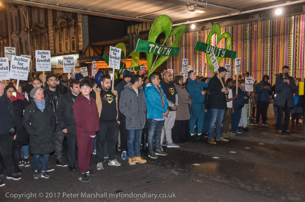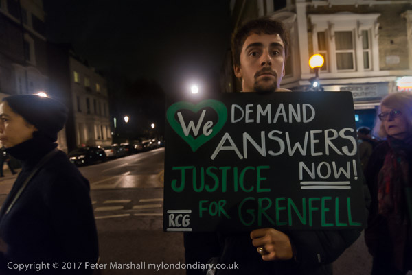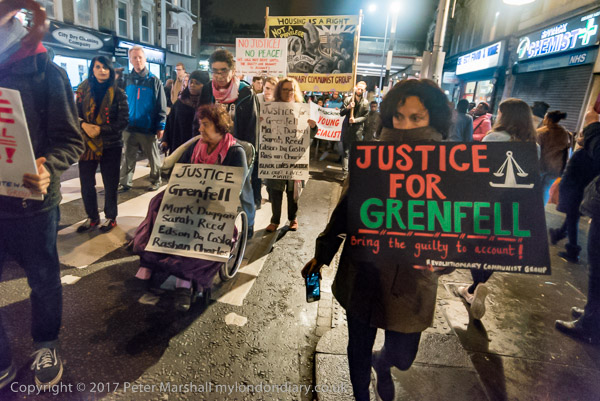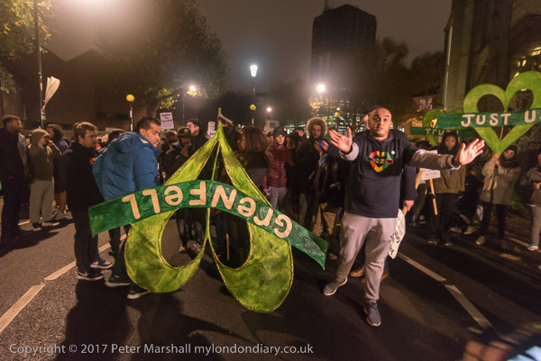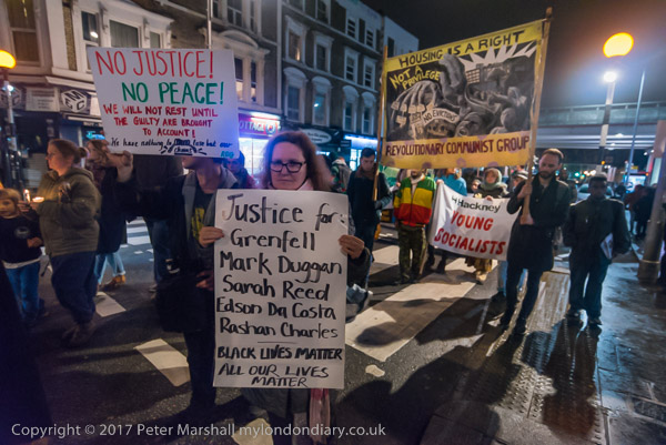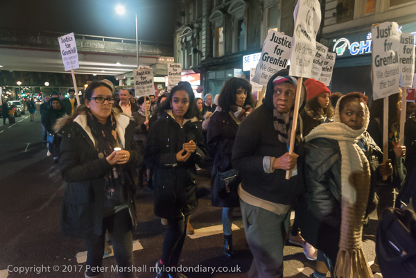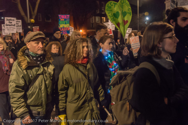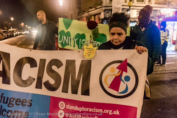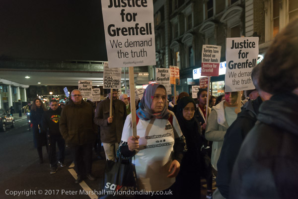 The burnt out shell of Grenfell Tower looms behind the marchers as
