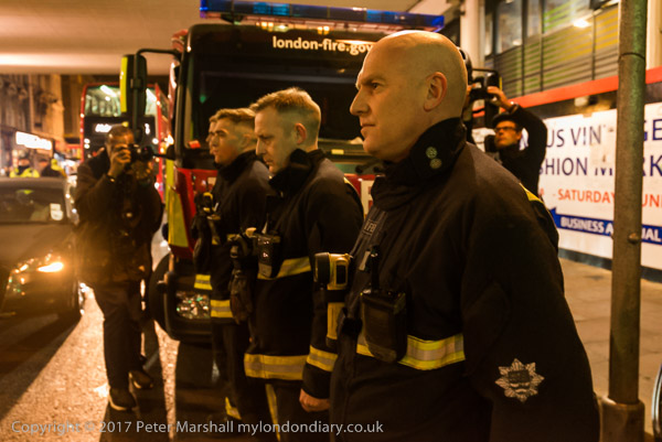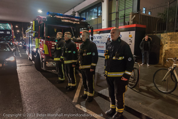At Ladbroke Grove firefighters stand in respect next to their fire