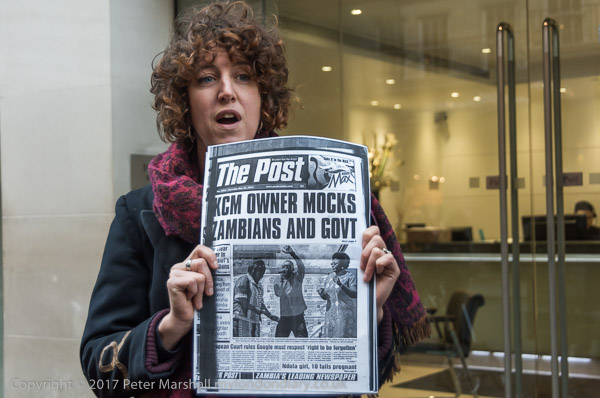 and holds up the Zambian newspaper front page about Vedanta's fraudulent