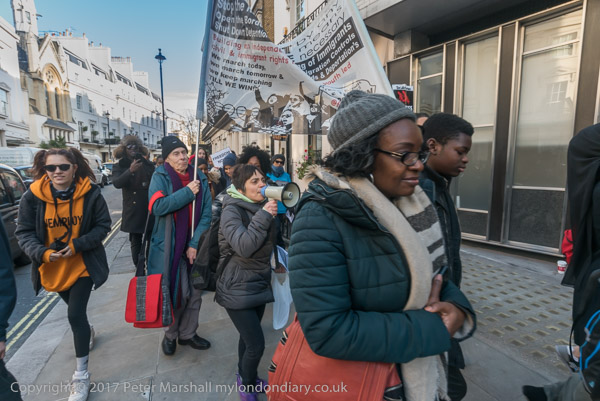 People meet in Belgrave Square. A woman holds two posters, 'Where