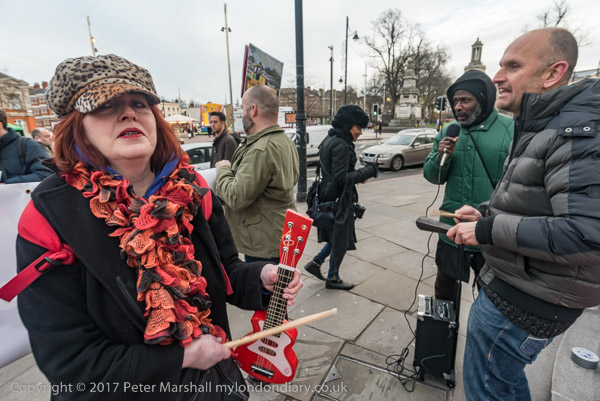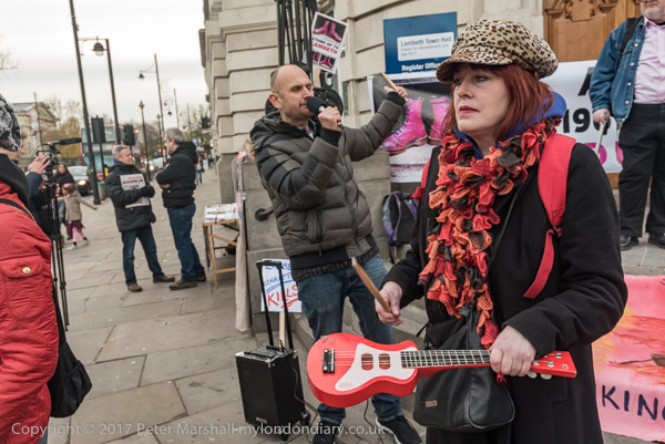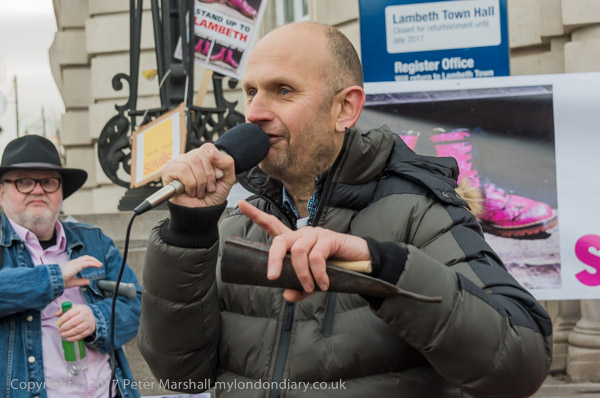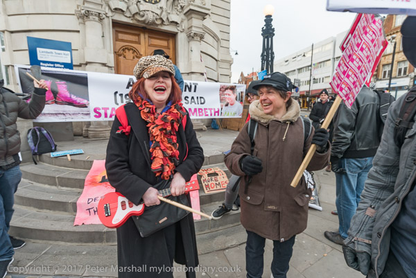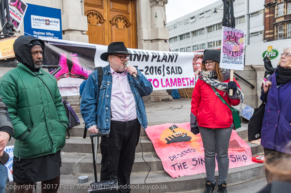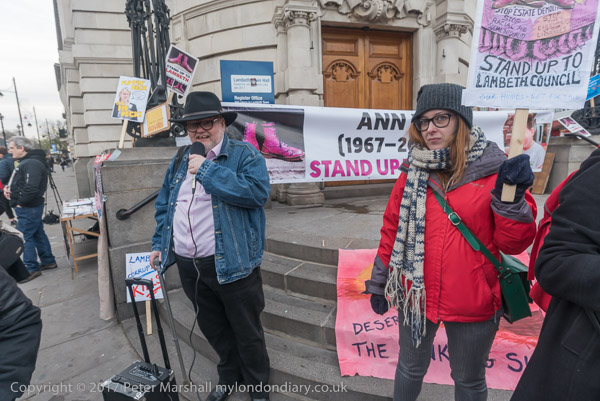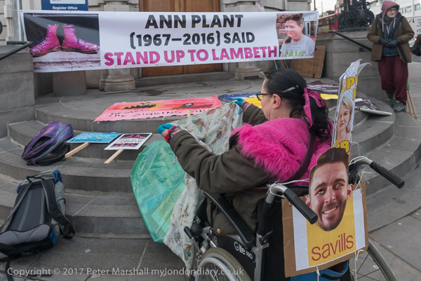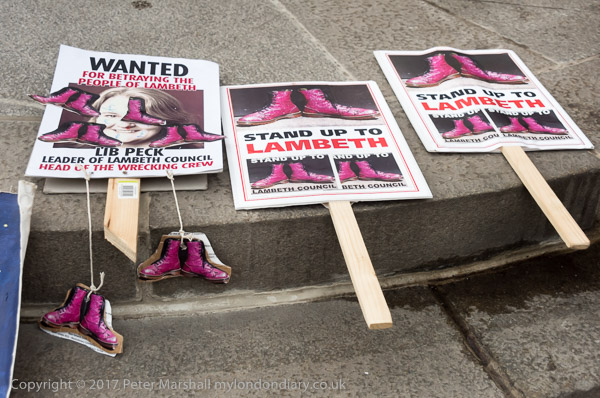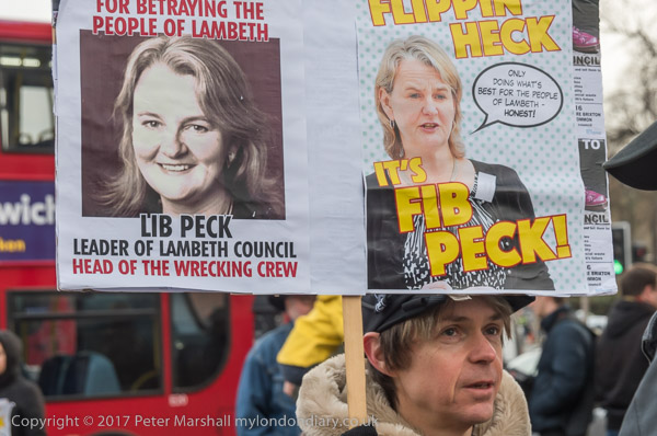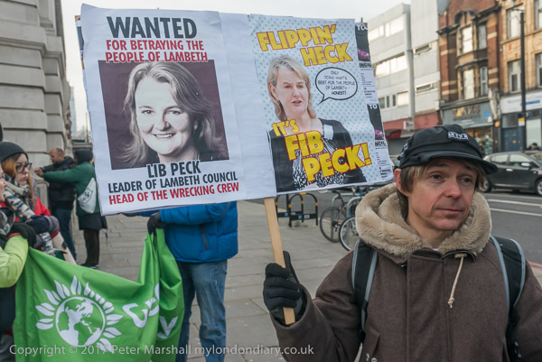 A Green Party member holds a 'Stand Up To Lambeth COuncil' placard