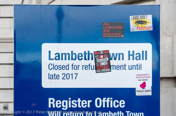 Stickers appeared as if by magic on the Town Hall sign. Lambeth Council