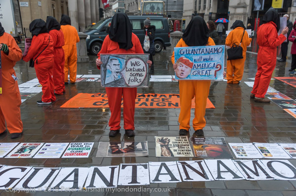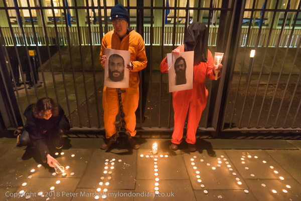 A Candlelight vigil outside the US Embassy marked the 16th anniversary of the illegal torture camp at Guantanamo bay where 41 prisoners are still held. Most are being held indefinitely without charge or trial and have permanent injuries from torture that would make their release embarrassing to the US (and possibly UK) authorities.