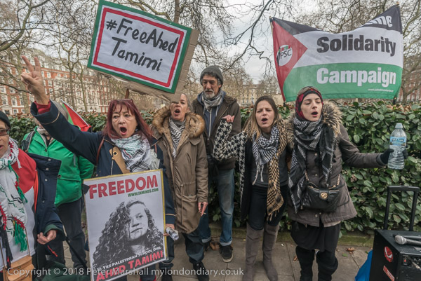 Among those leading the protest was Nana Hourriyah, a cousin of Bassem Tamimi, who is Ahed's father, and there were others present with family links to Palestine and who had spent time in the country. One of the speakers was Robert Inlakesh who had returned recently from three months spent there staying with Palestinian families, and who was deported by the Israeli authorities for having taken part in a peaceful demonstration. He had stayed with the family of another child prisoner, Abdul Khalik, before his arrest and knew him well.
