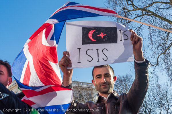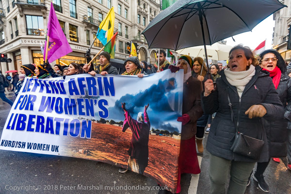 Several thousand people, mainly Kurds, march through London from outside the BBC to a rally opposite Downing St, calling for an end to the attacks by Turkish forces on the Afrin Canton of Northern Syria, now a part of the Democratic Federation of Northern Syria (DFNS) or Rojava, a de facto autonomous region in northern Syria.