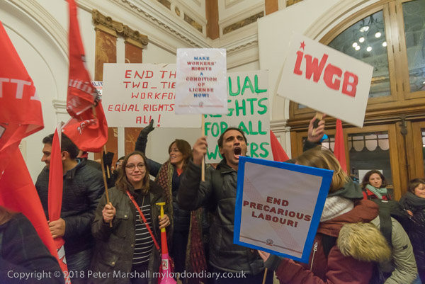Independent Workers Union of Great Britain members and supporters swarmed into the foyer of the Royal College of Music in an unannounced protest this evening in support of the cleaners there.