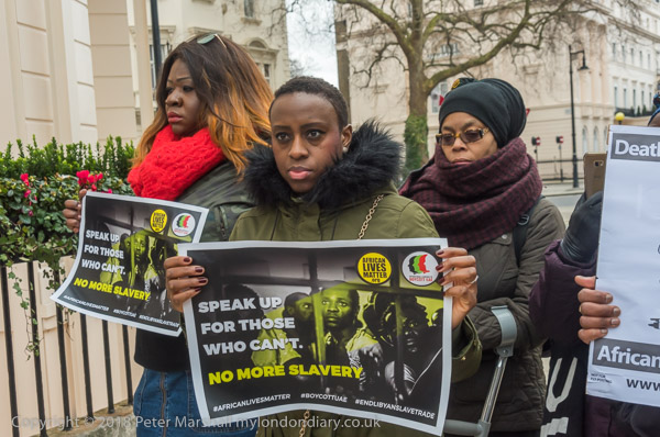 African Lives Matter and the International Campaign to Boycott UAE protest at the UAE Embassy in London against the funding by the the United Arab Emirates United of armed Groups in Libya which imprison, torture and kill African migrants and sell them as slaves.