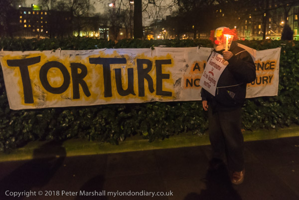 Banners on the hedge include one with the word 'TORTURE' written large