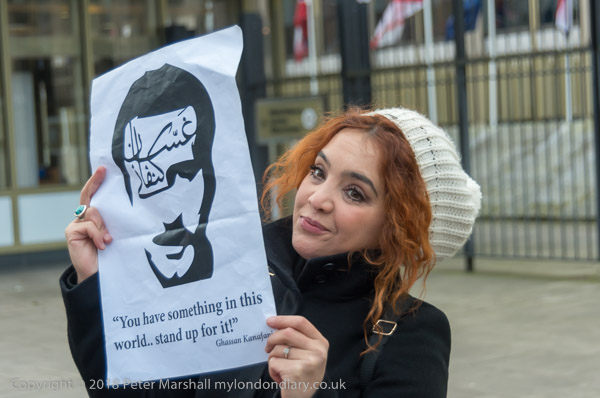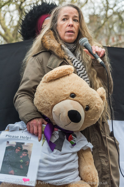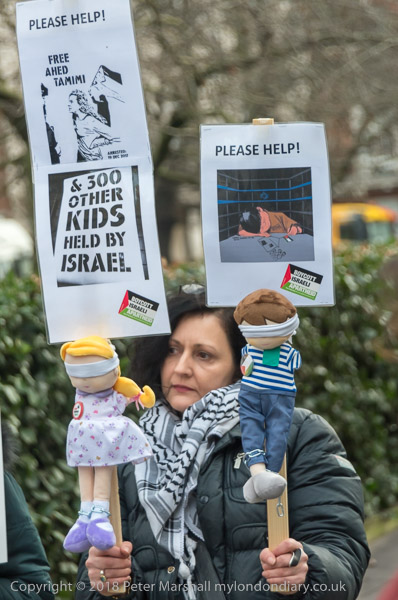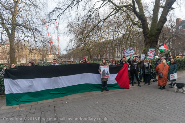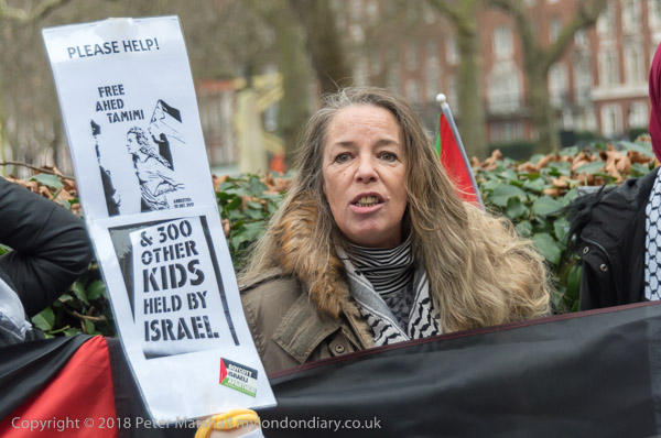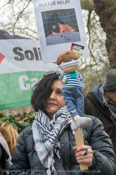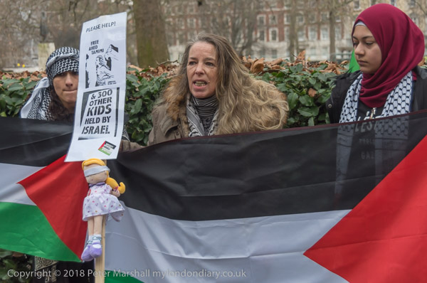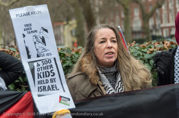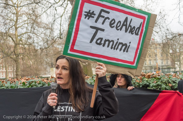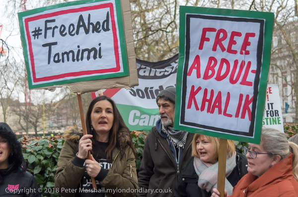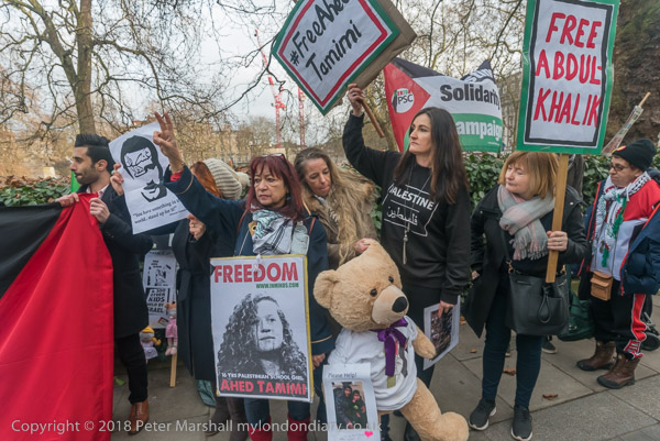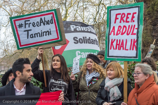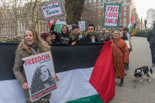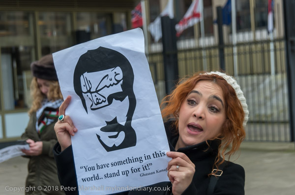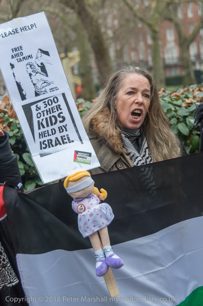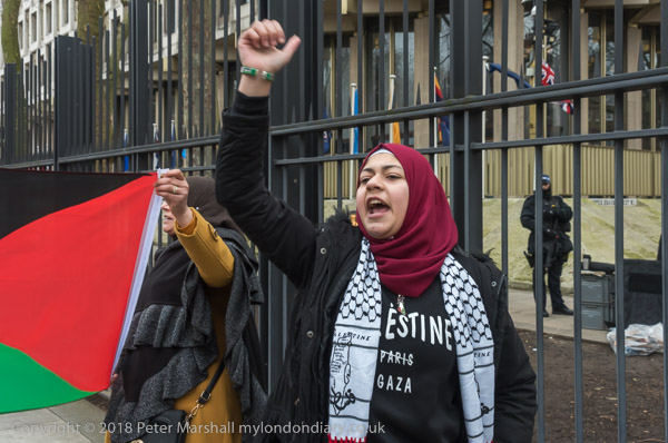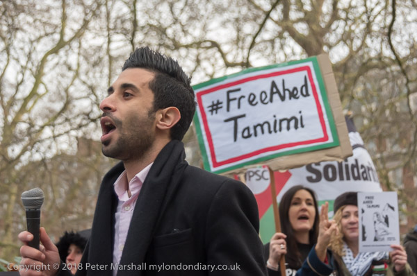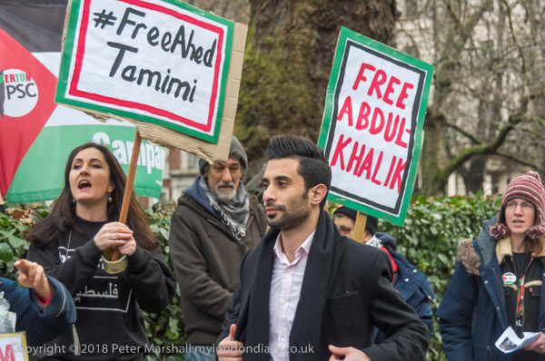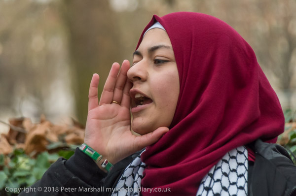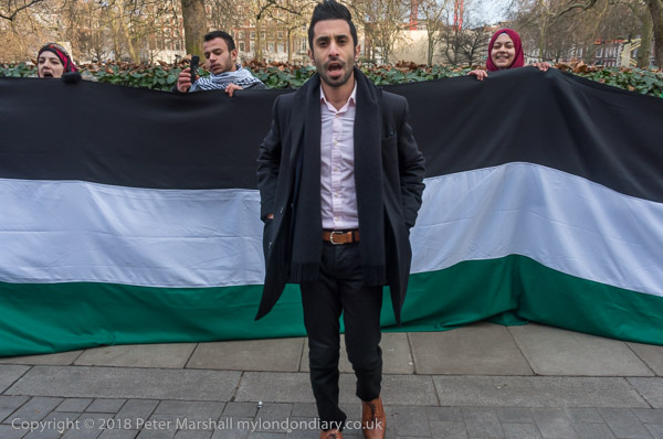 and a Palestinian stands in front of it to lead the chanting of slogans