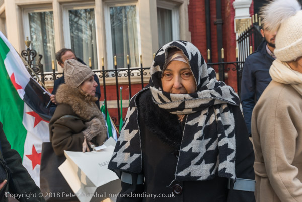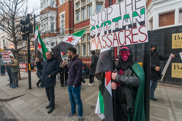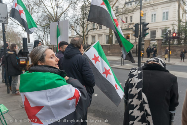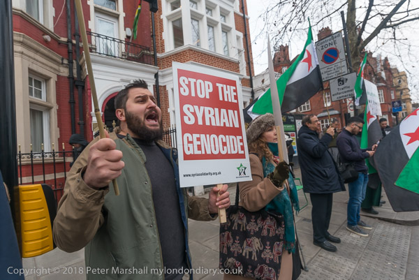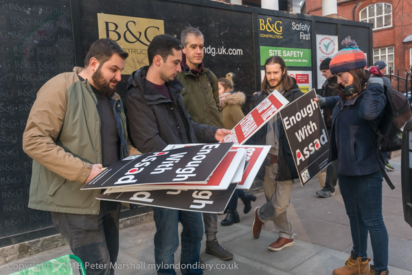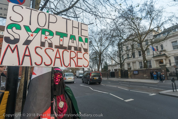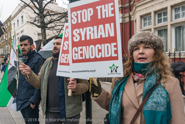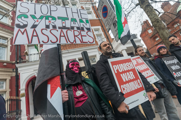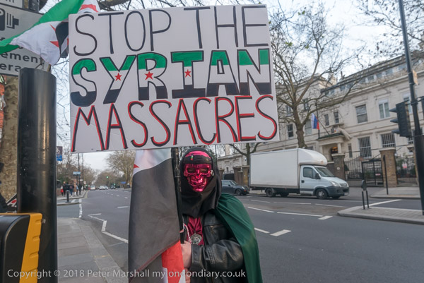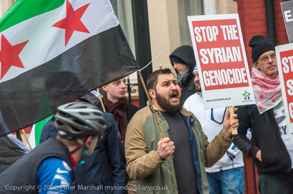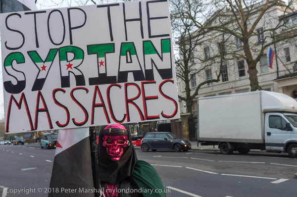 One protester holds up a large placard 'Stop the Syrian Massacres'