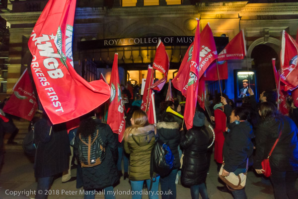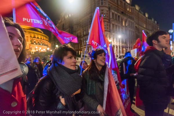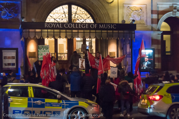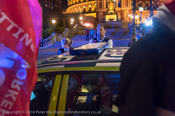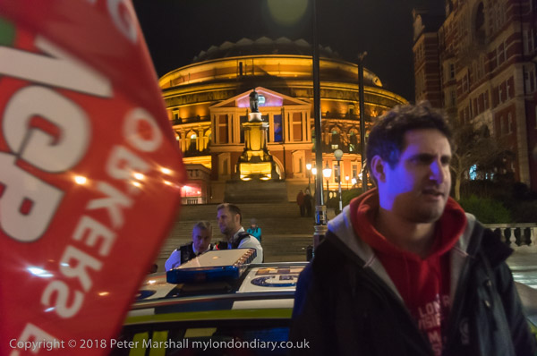 Police watch the protest. In the background is the Albert Hall