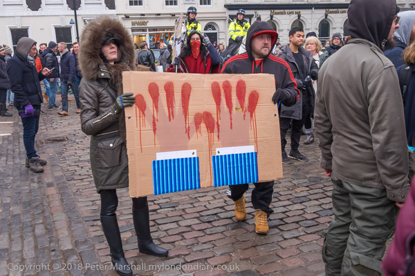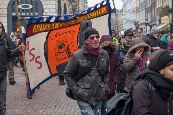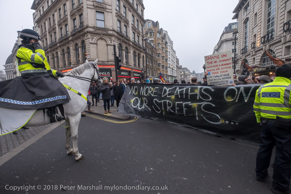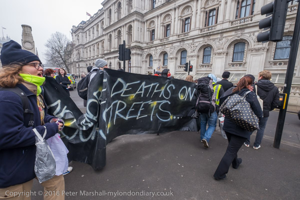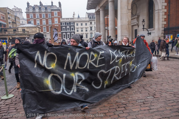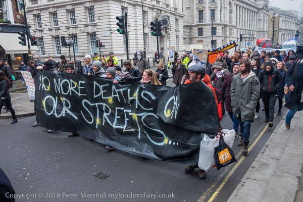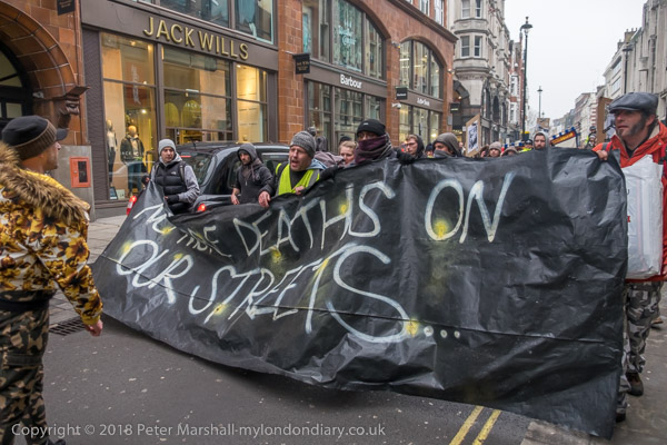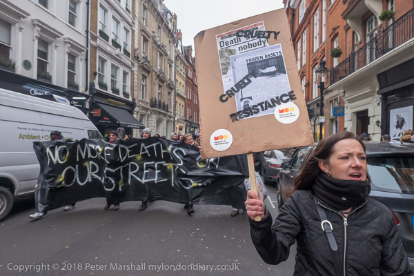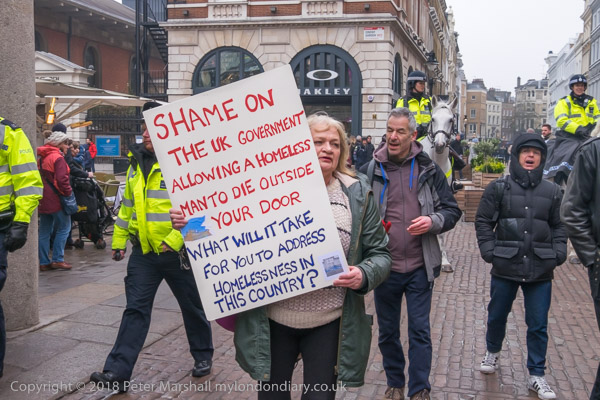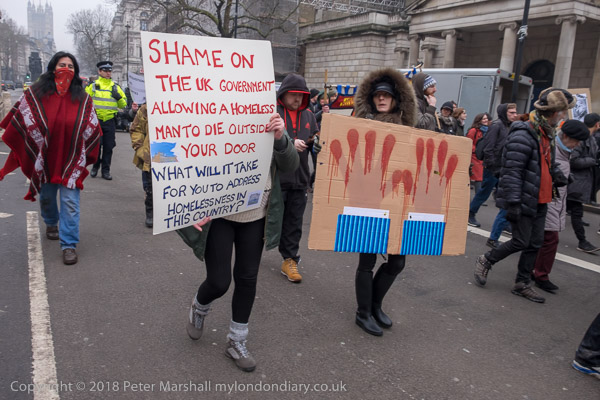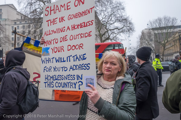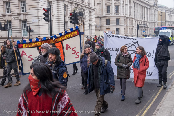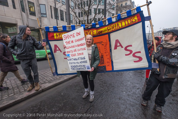 and people hold placards and the Homeless Autonomy banner 'occupy