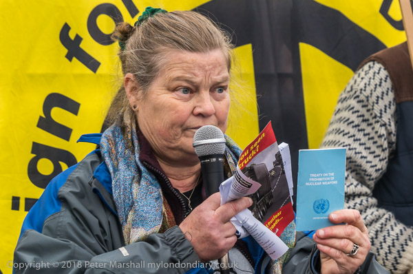 Among the speakers was Rebecca Johnson of CND and ICAN who held up a copy of the treaty and the replica of the Nobel award and urged everyone to keep up the pressure on the UK government to sign the treaty, pointing out that past governments had professed support for multilateral nuclear disarmament such as this treaty, and that Britain's nuclear expertise would give opportunities for greater earnings from disarmament than from bomb-making. Walter Wolfgang, now in his 90s, and one of the organisers of the first Aldermaston march, spoke as did a woman who had been taken on it by her parents, while veteran peace campaigner Bruce Kent recalled how he had cursed it as a young cleric in Kensington as it blocked the road for several hours and disrupted the schedule of four weddings he was conducting, going on to tell us of his conversion to nuclear disarmament not long afterwards. Antony Owen told us of his experiences speaking with those who survived the Nagasaki bomb and read two poems from his book 'The Nagasaki Elder' which had many of us listening in tears. Music came from the samba band Tribo and the Welsh socialist choir Côr Cochion.