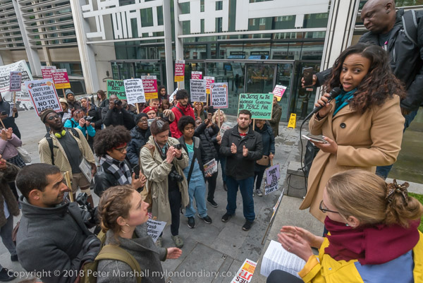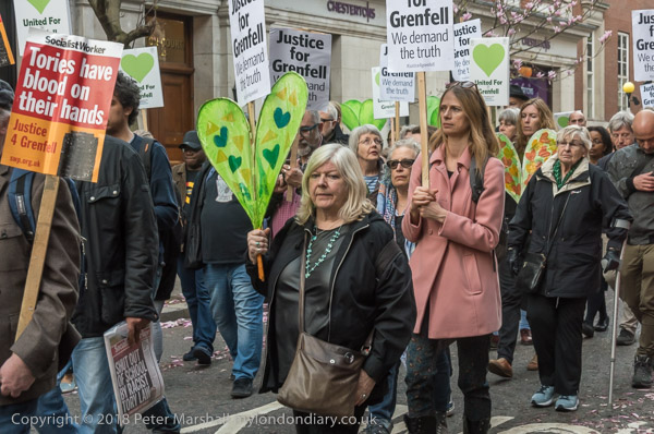 After speeches from the CSC, Moyra Samuels of Justice4Grenfell and a nursery worker from the nursery in the tower there was a short silence in their memory. The speakers made clear that as more comes out about the disaster it becomes clearer that it was entirely preventable, and the the actions of the council and its TMO in specifying flammable cladding, applying it improperly, providing inadequate fire doors, and various other faults showed a culture that disregarded the safety of social housing residents, whose concerns about building safety were ignored.
