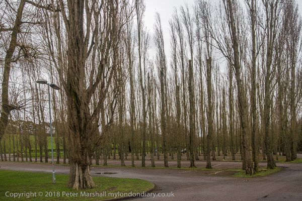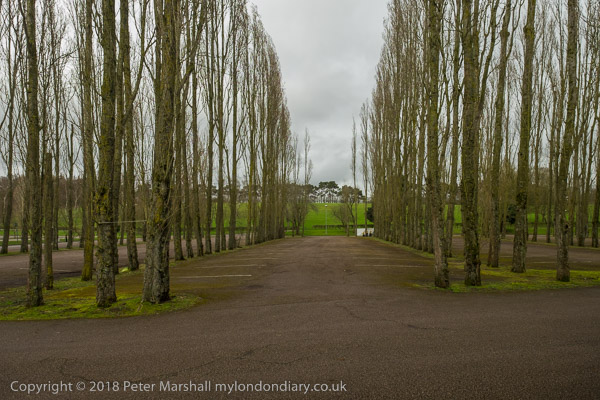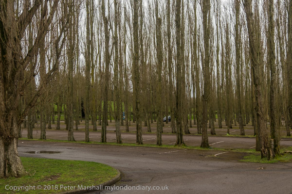 and a car park with tall and very regularly planted trees