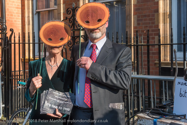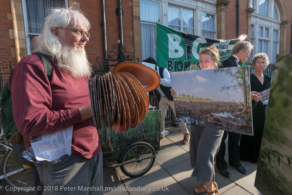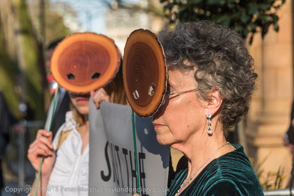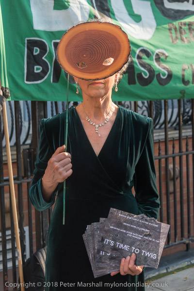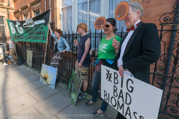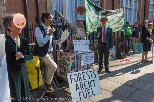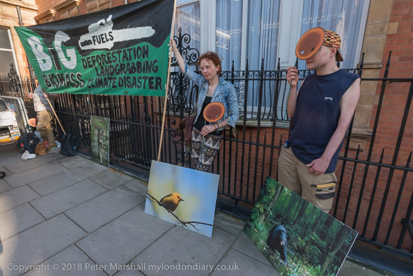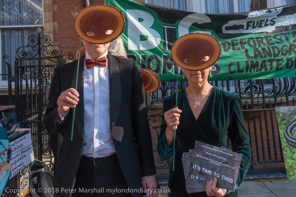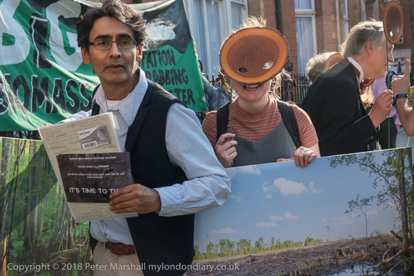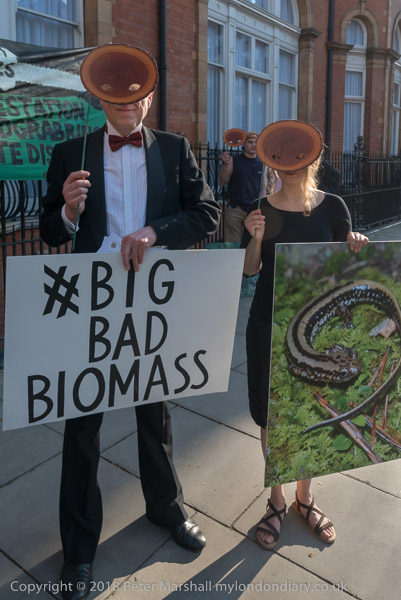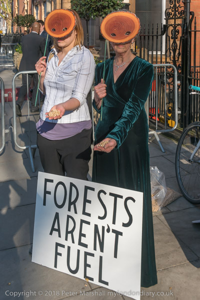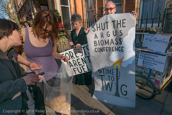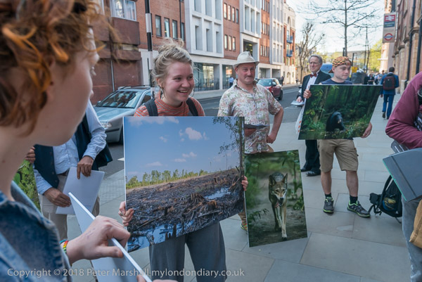 Campaigners hold pictures of a forest destroyed for wood chips and