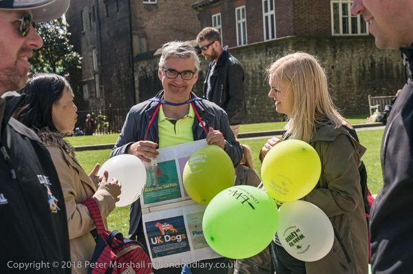 A sufferer who now has to use a wheelchair holds a poster and a balloon