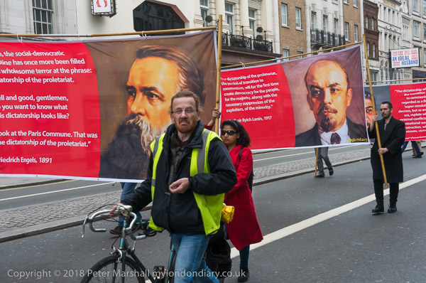 Large portraits of Engels and Lenin with quotations