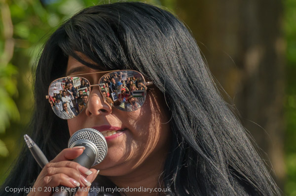 Protesters were reflected in her glasses as she spoke