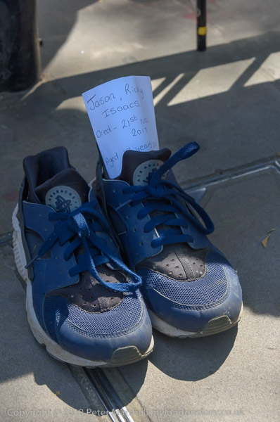 Empty shoes with the names of victims