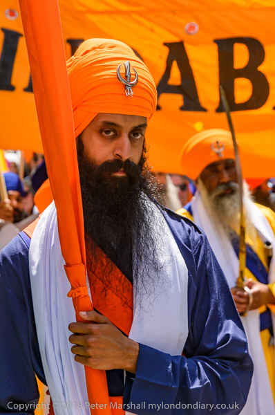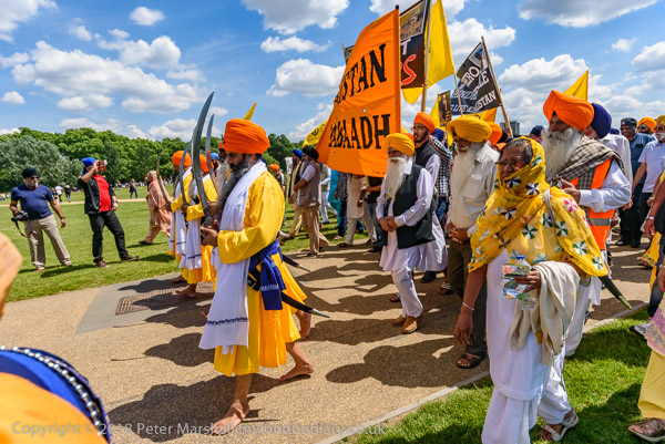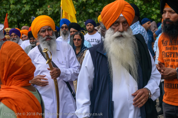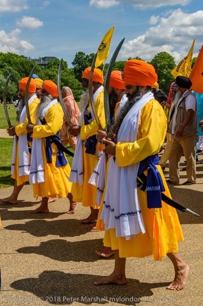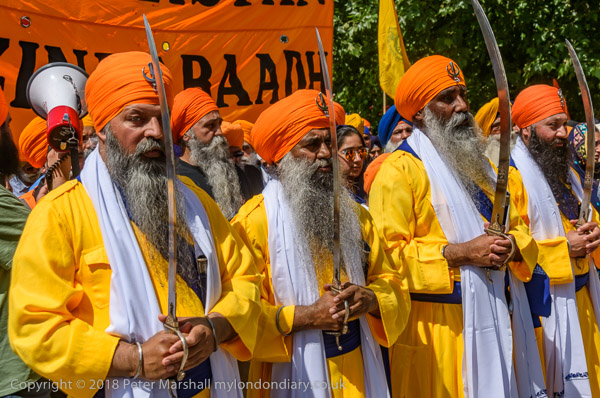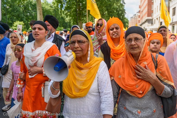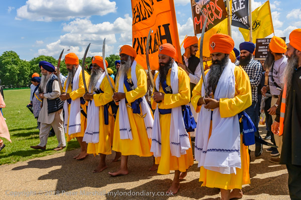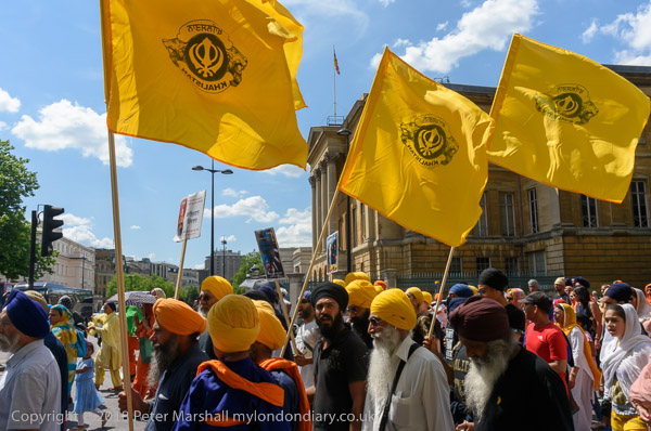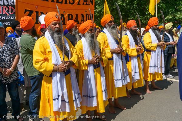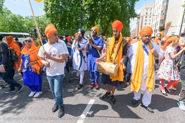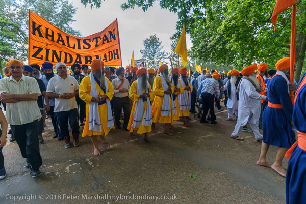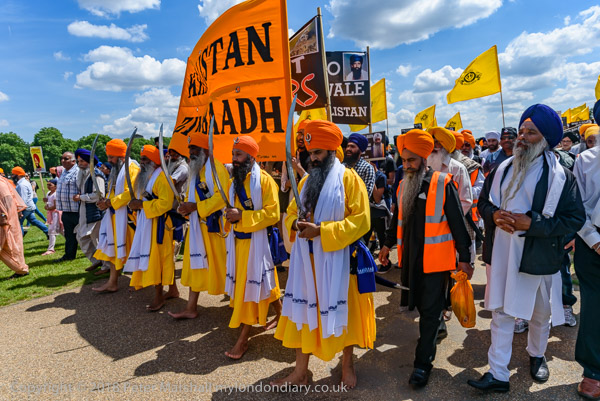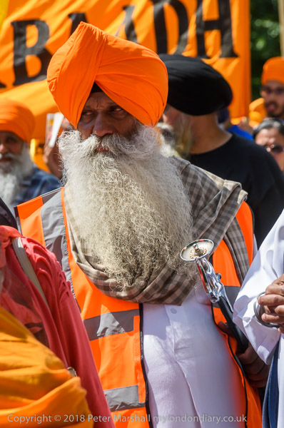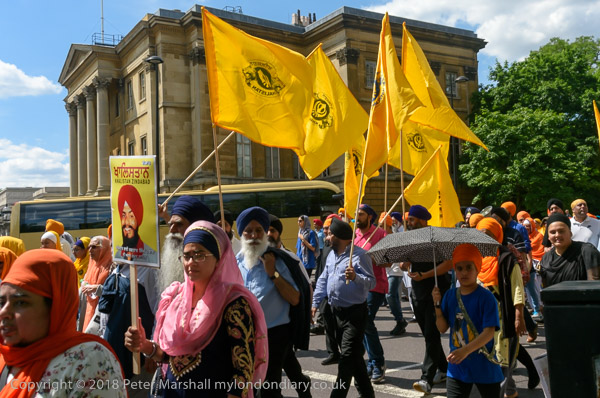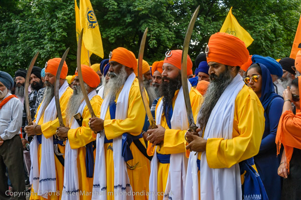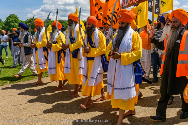 Marchers walk slowly behding the barefooted five Khalsa with their