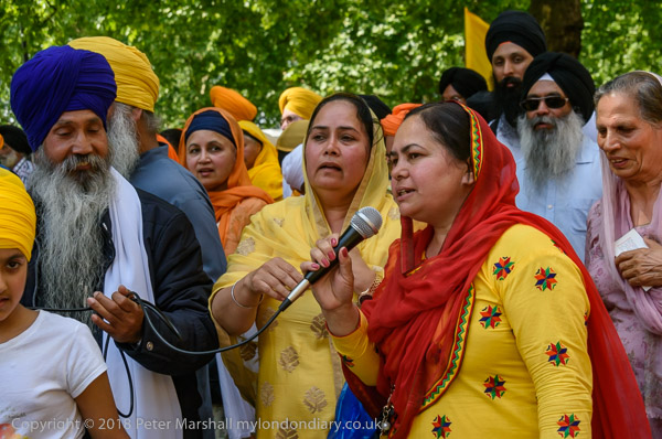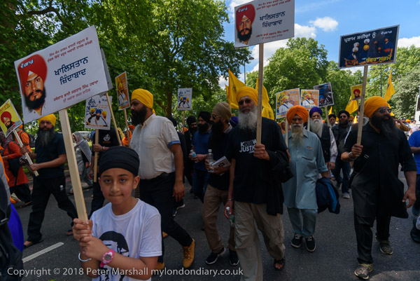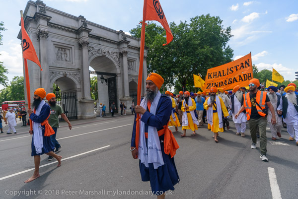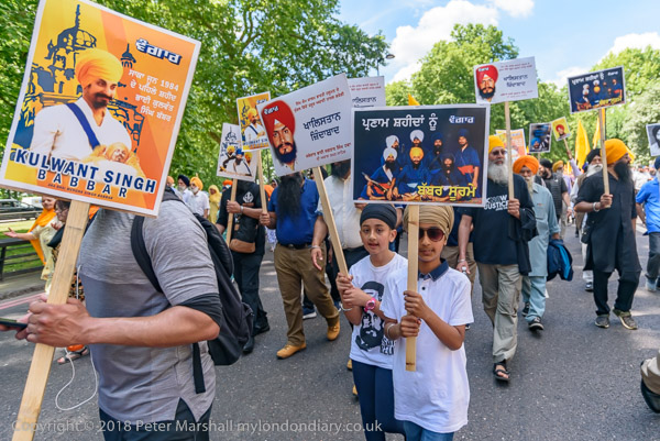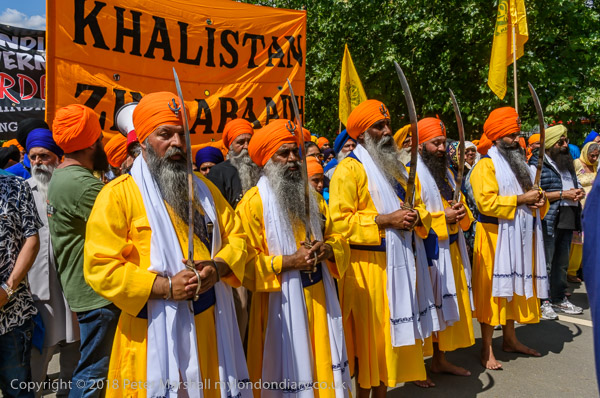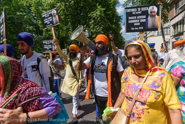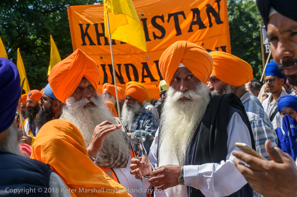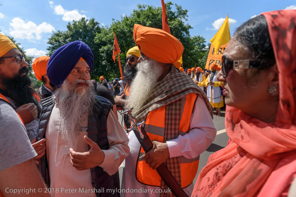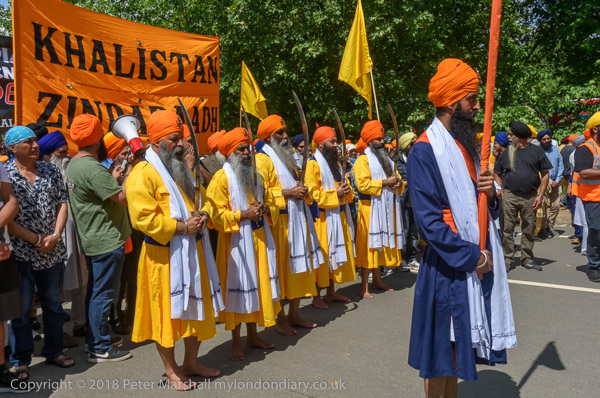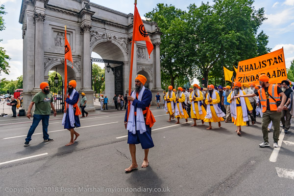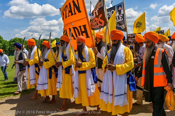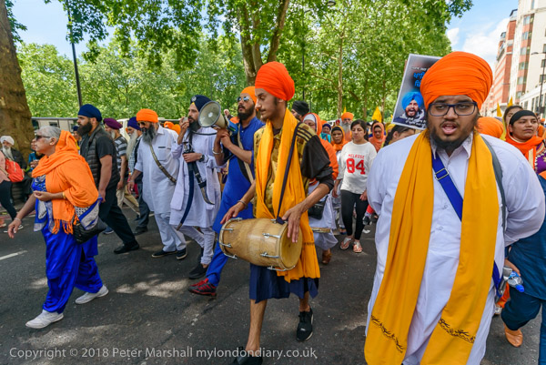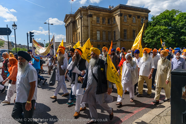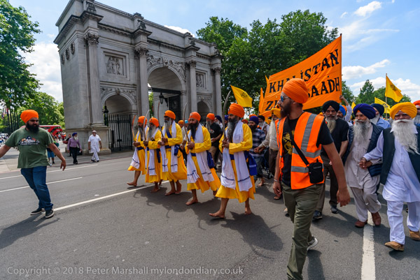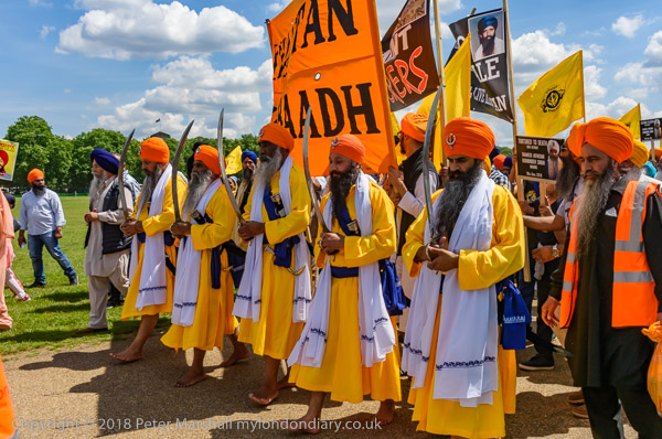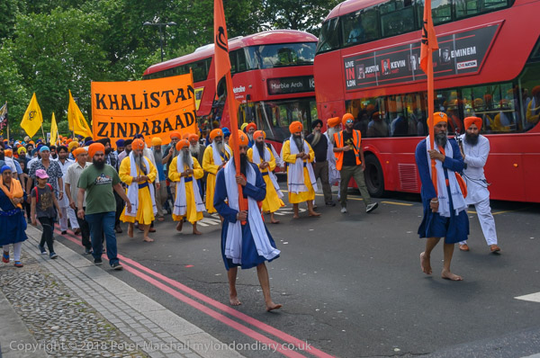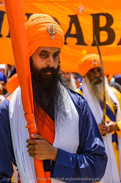 Marchers walk slowly behding the barefooted five Khalsa with their