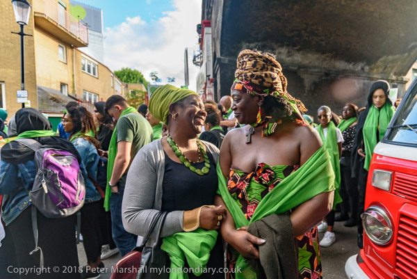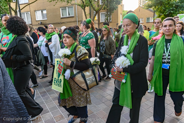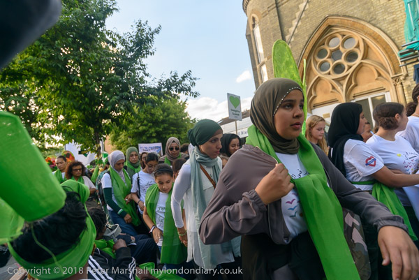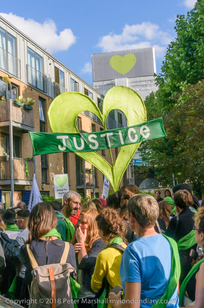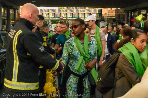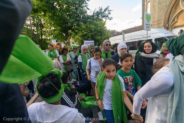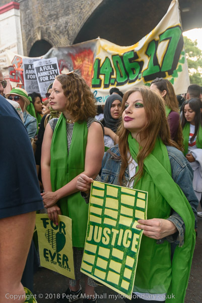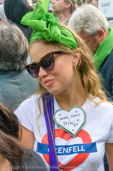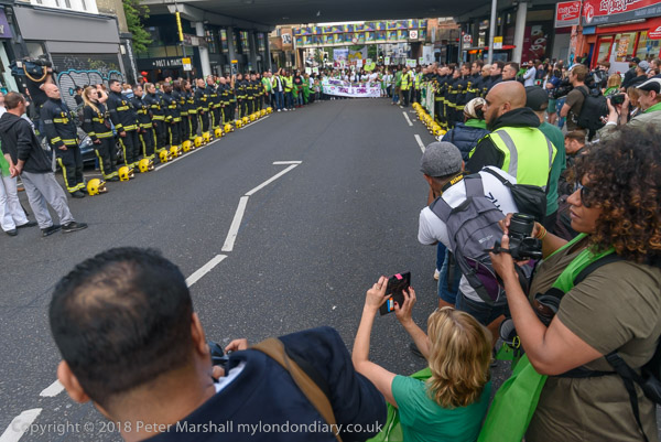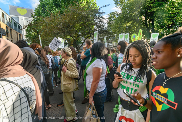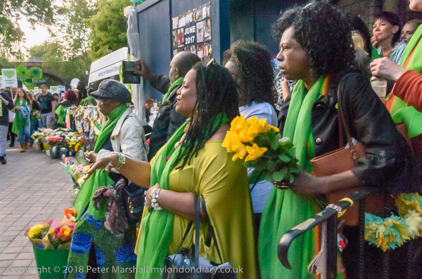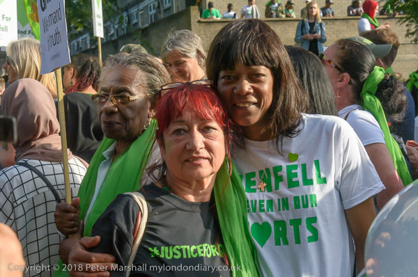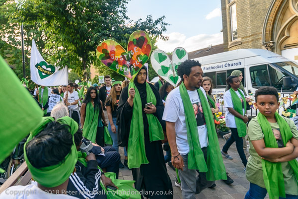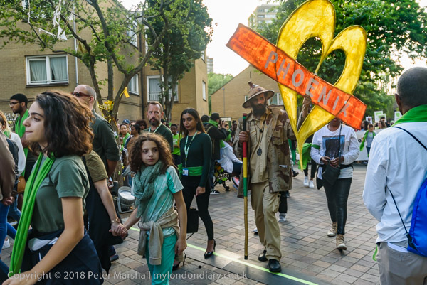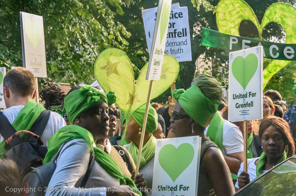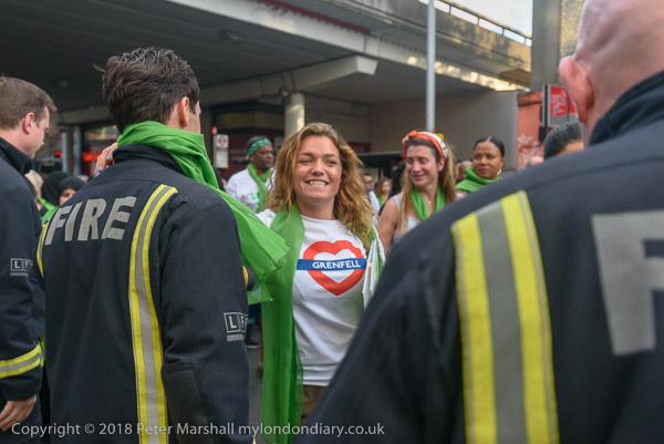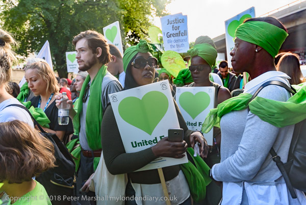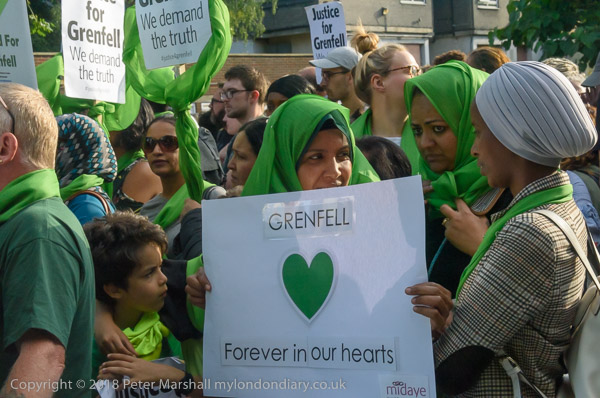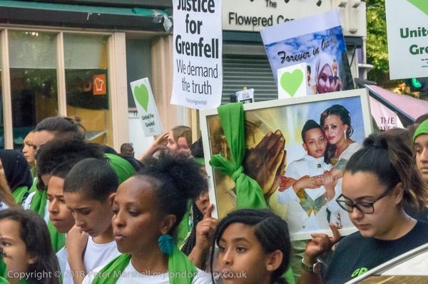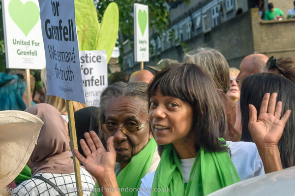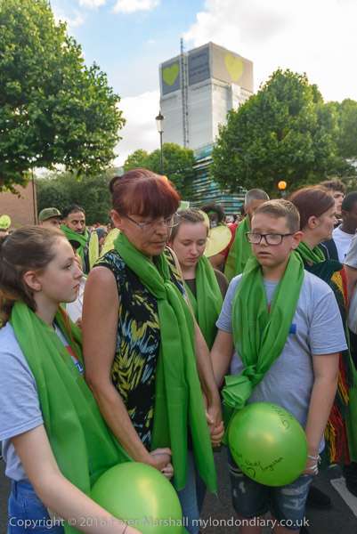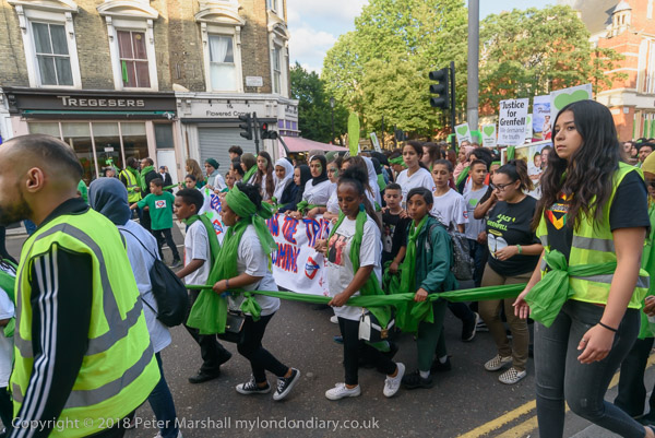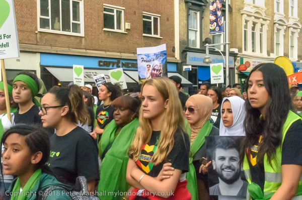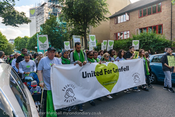 The march pauses briefly on Lancaster Rd - with Grenfell Tower still