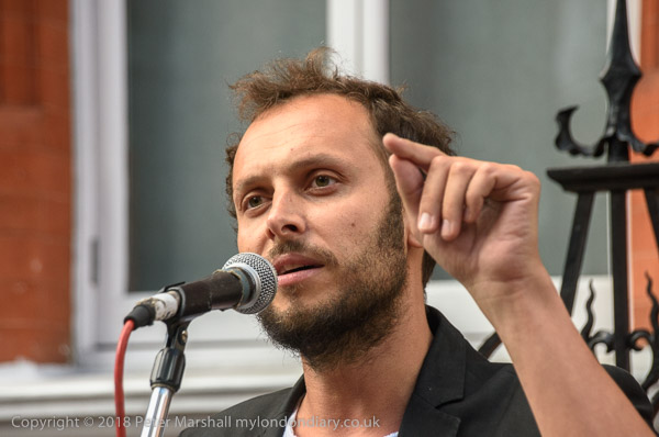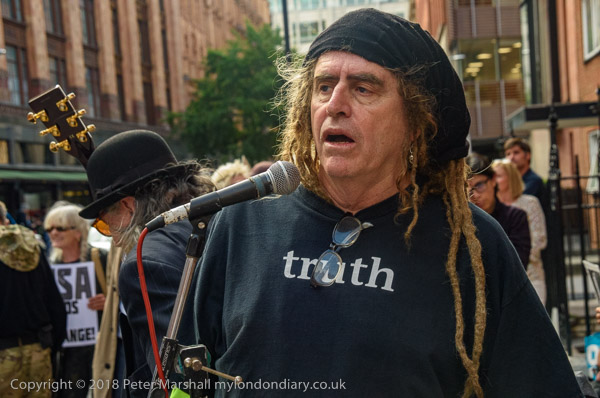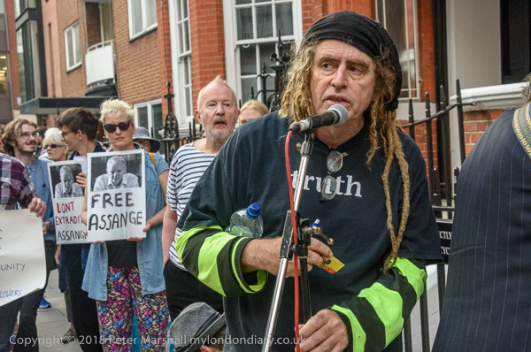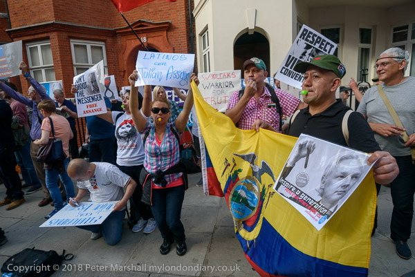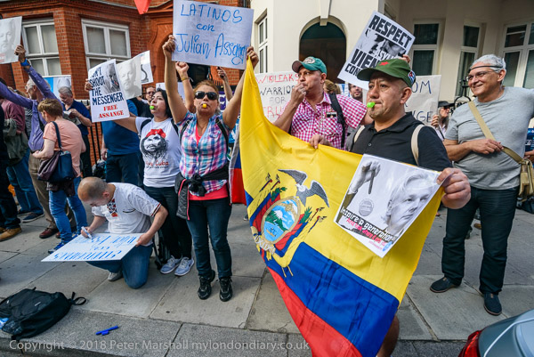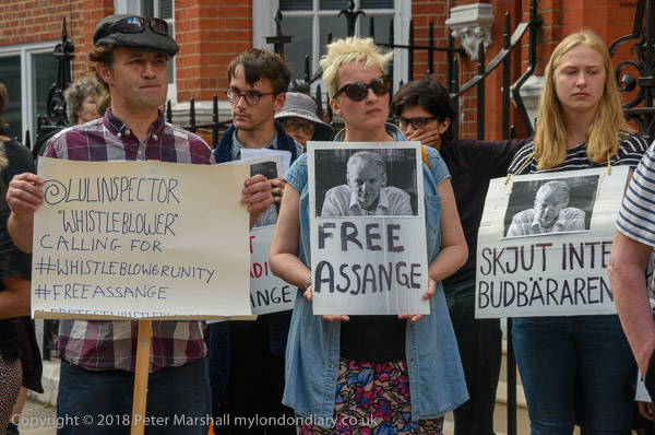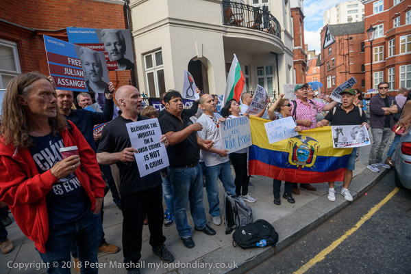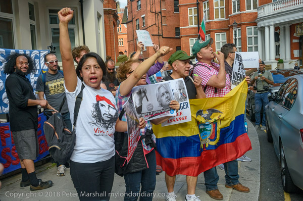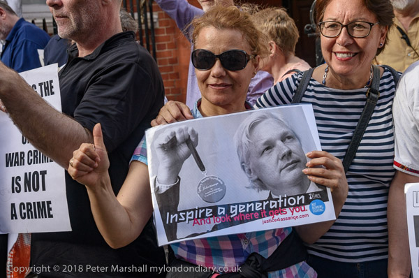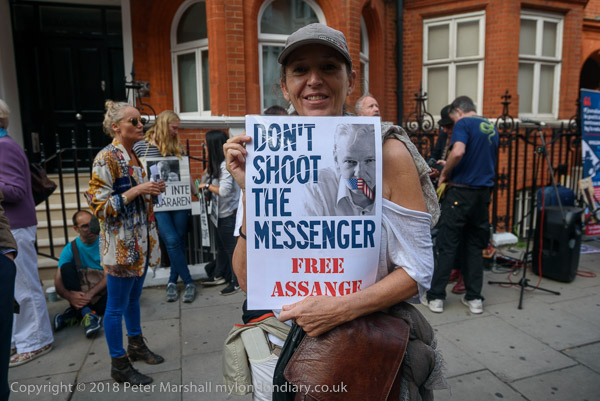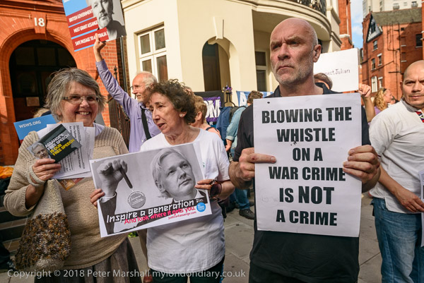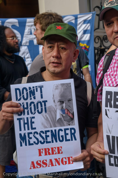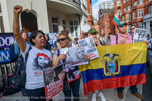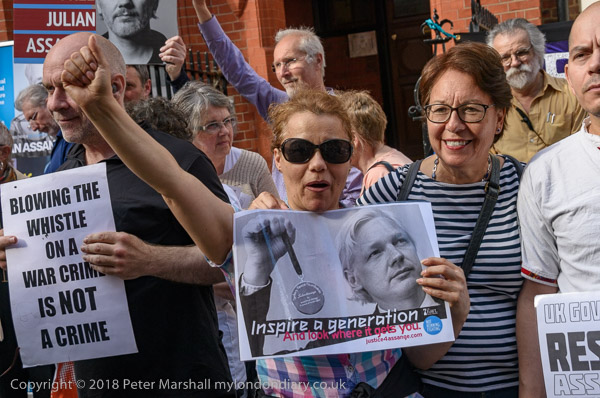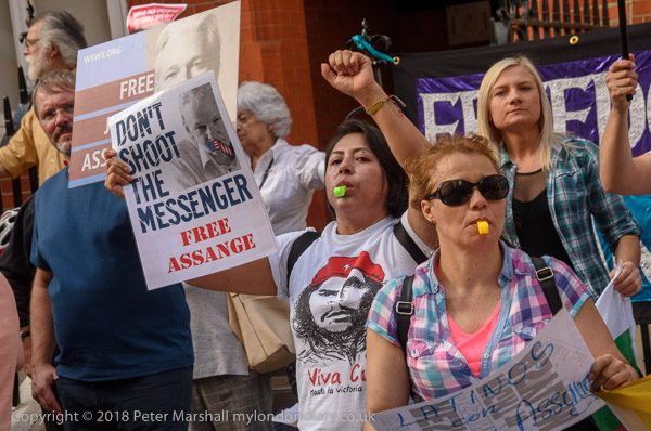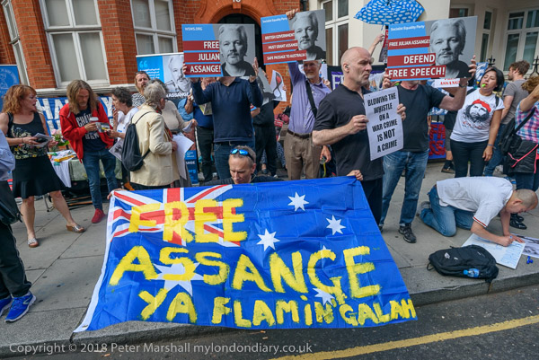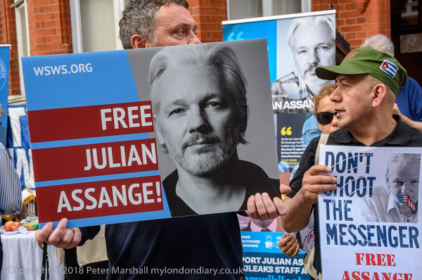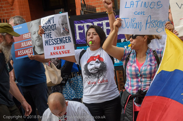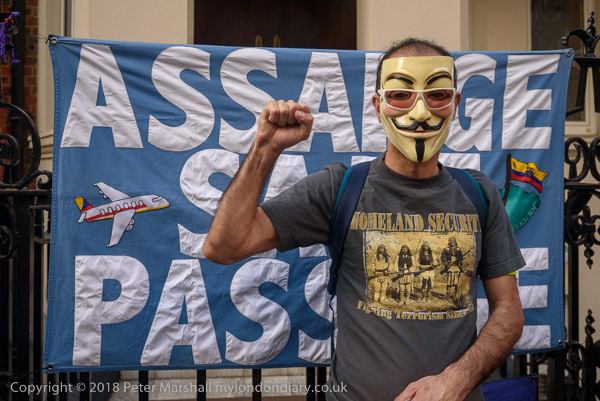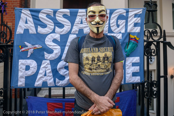 'Assange Safe Passage' and a protester in an 'Anonymous' mask