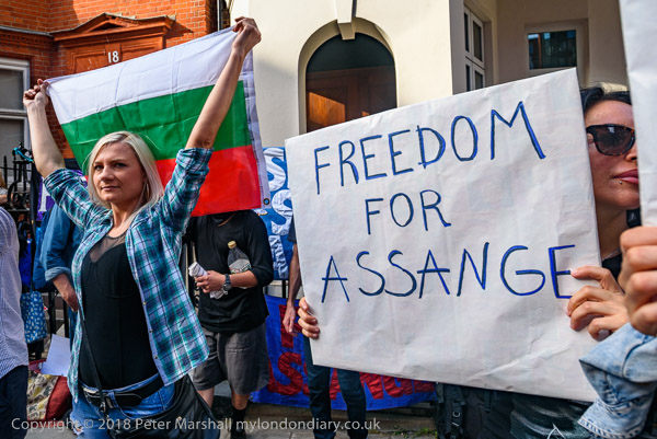 'Freedom for Assange' A woman holds a Bulgarian flag