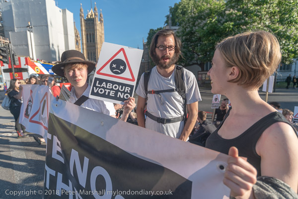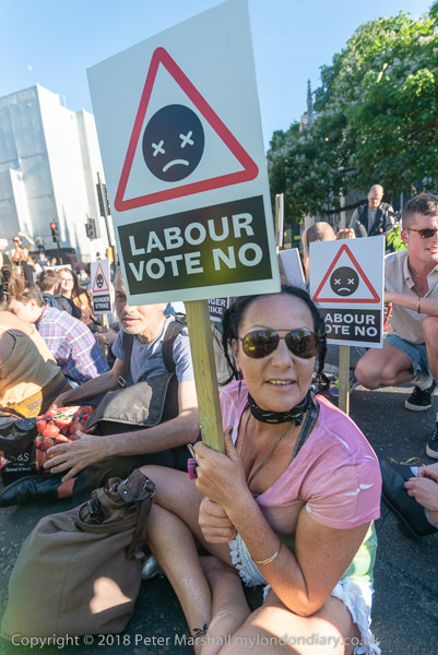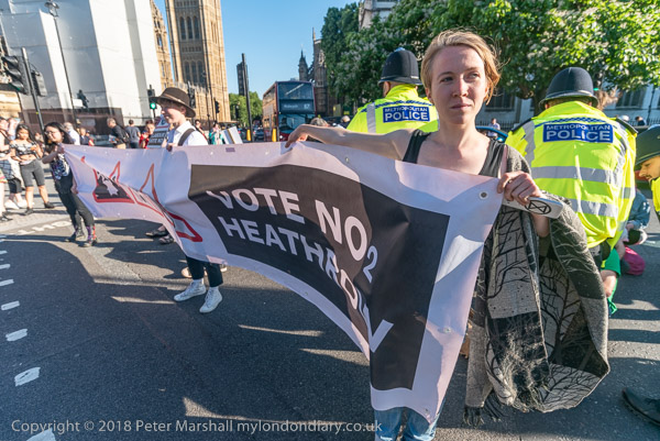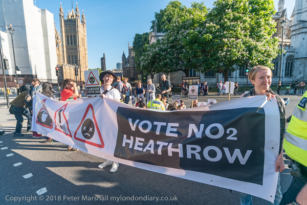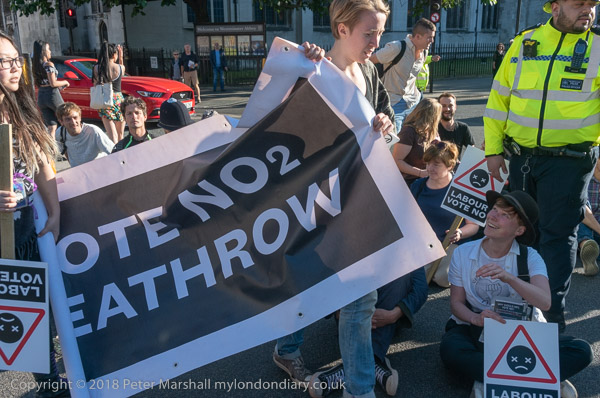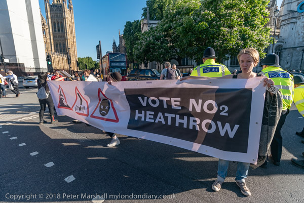 and hold it in front of the protesters 'Vote No 2 Heathrow' and NO2