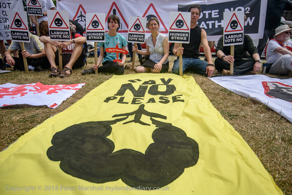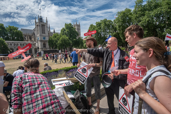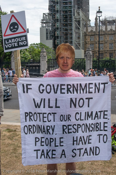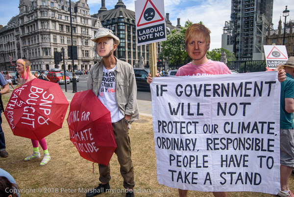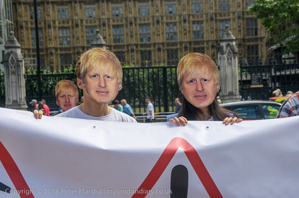 Several protesters wear Boris Johnson masks. The MP from Uxbridge