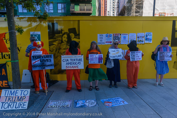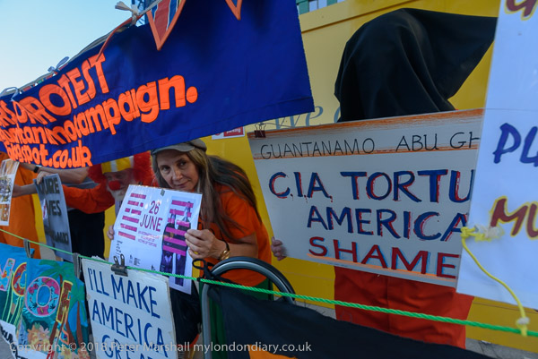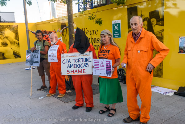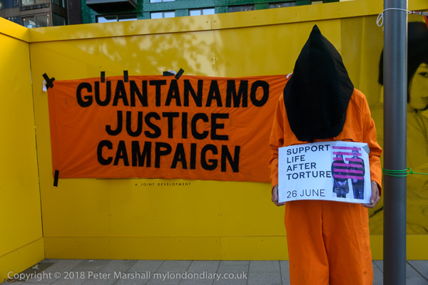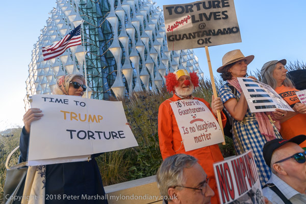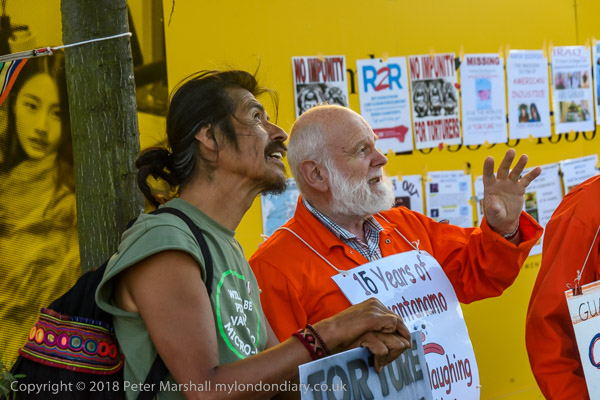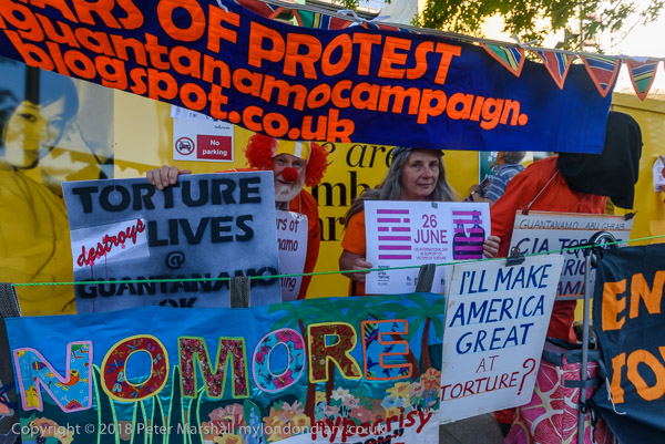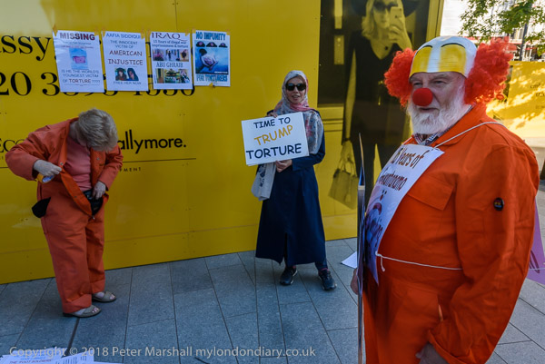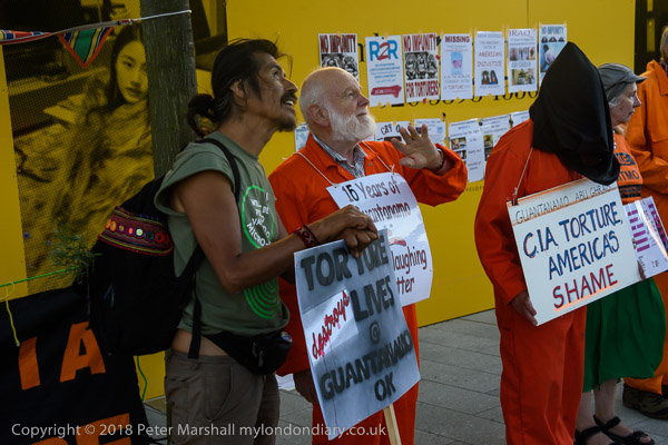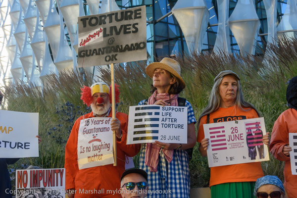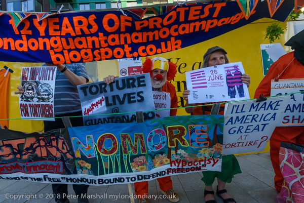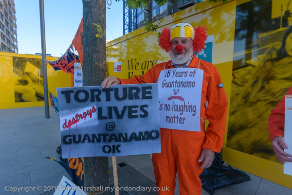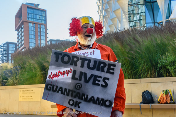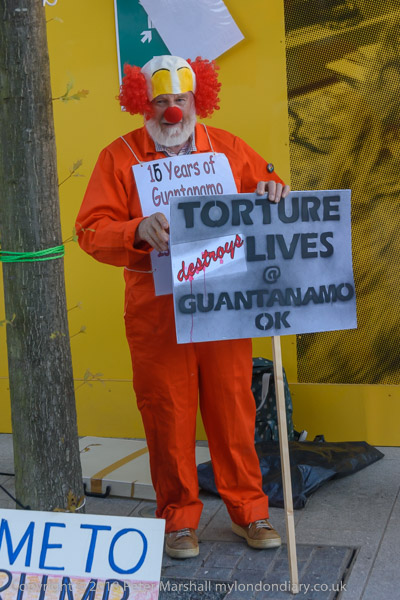 A man in clown headdress reminds us that 16 years of Guantanamo is