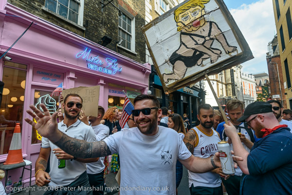 Back at Soho Radio, a placard shows Trump crawling on the floor