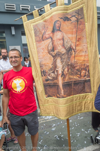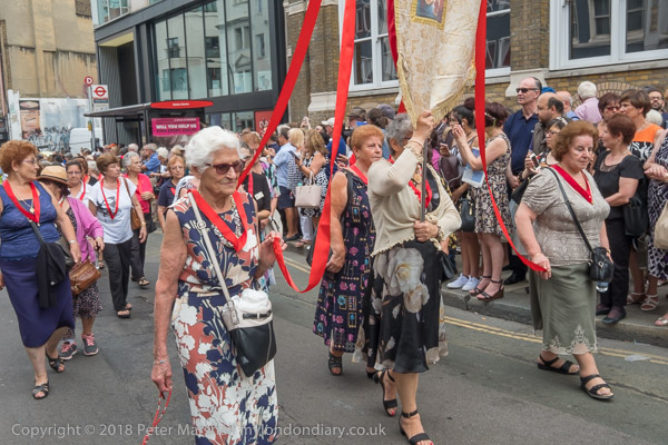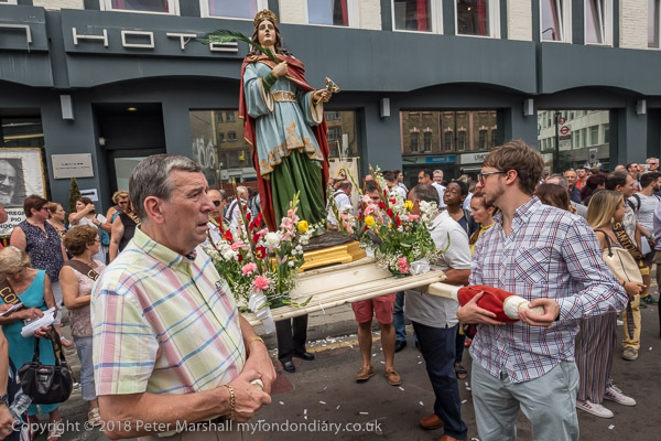 Men prepare to join the procession carrying a statue
