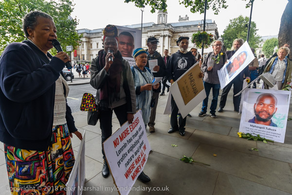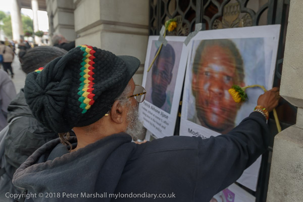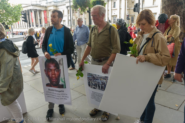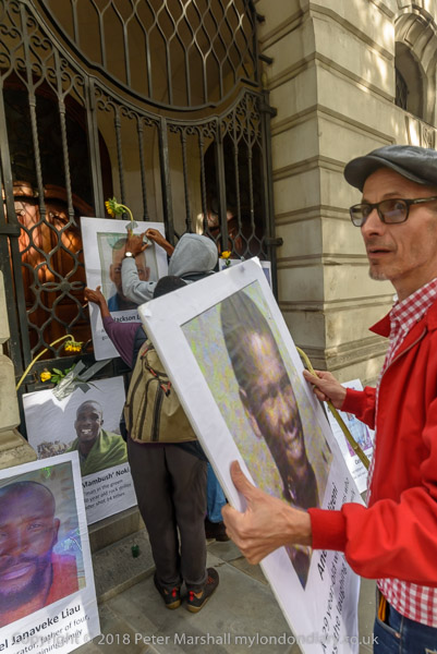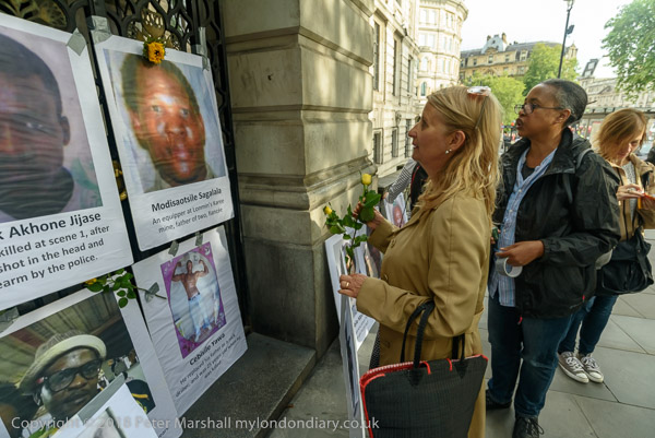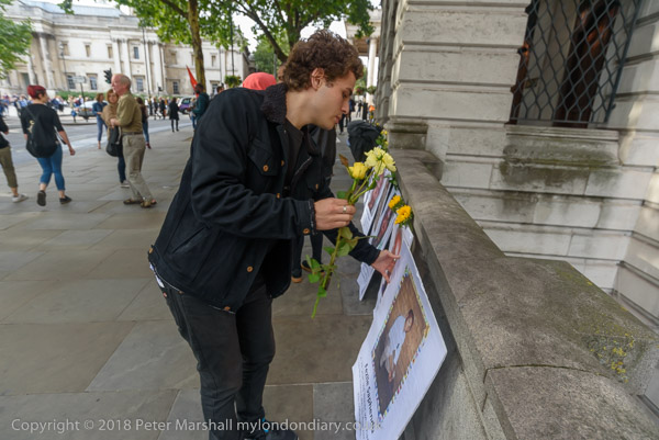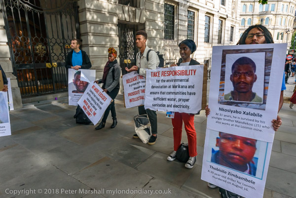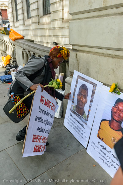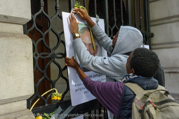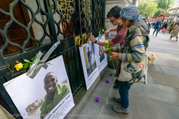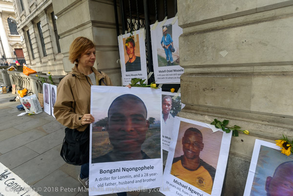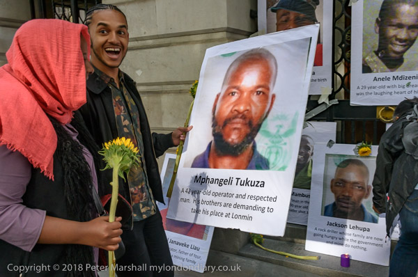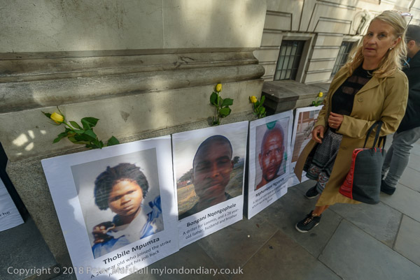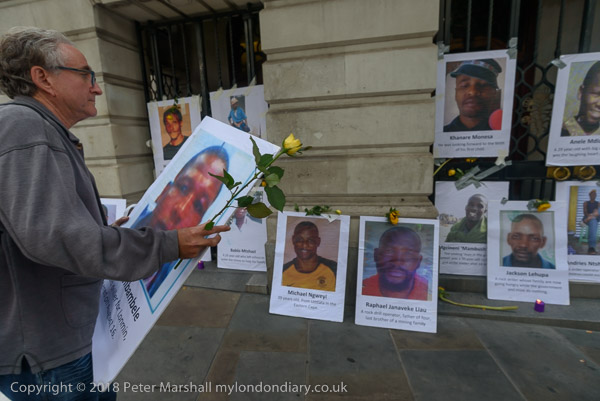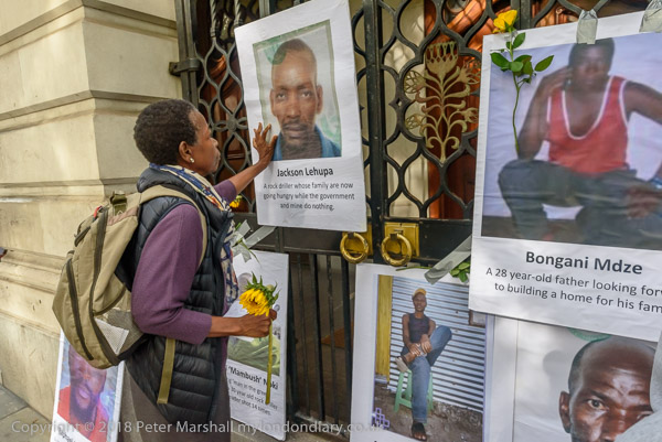 People read the name of one of the murdered strikers then take flower to lay in his memory Flowers and portriats of the murdered miners on the locked gates of South Africa House0 The protest ends