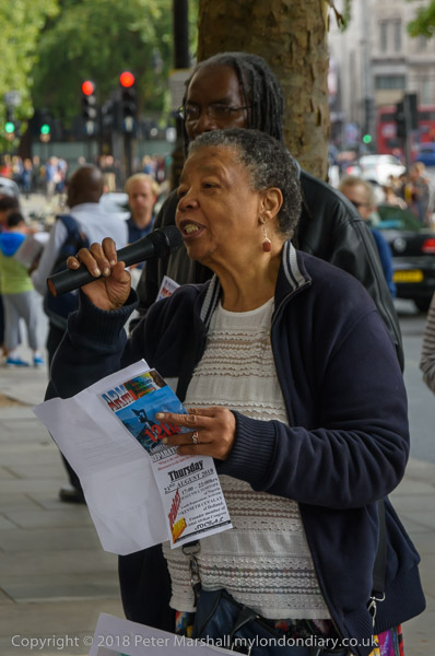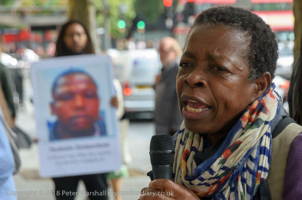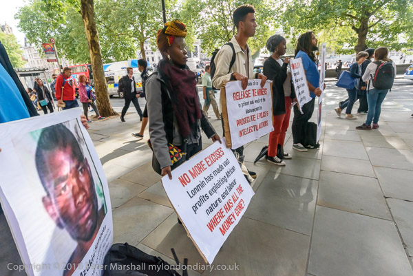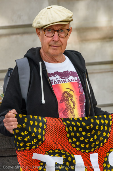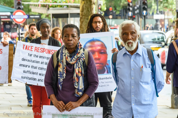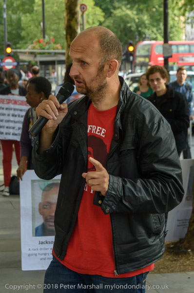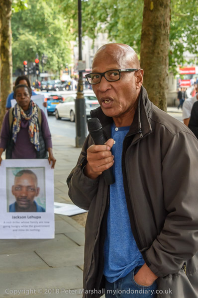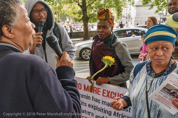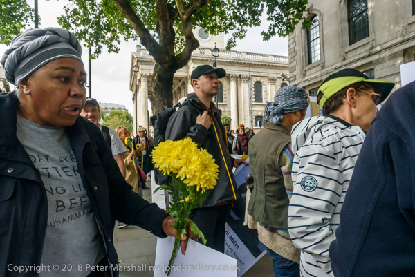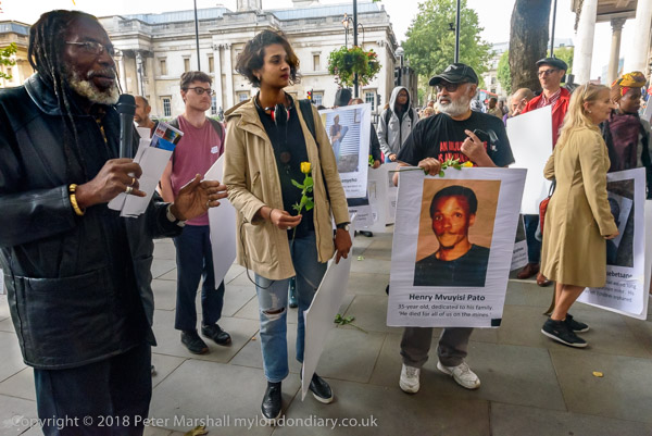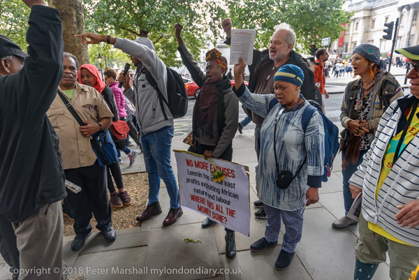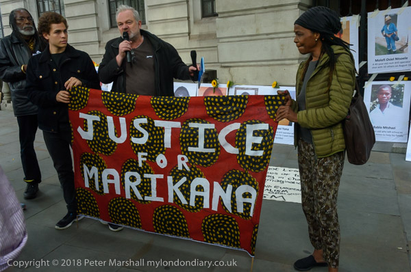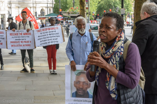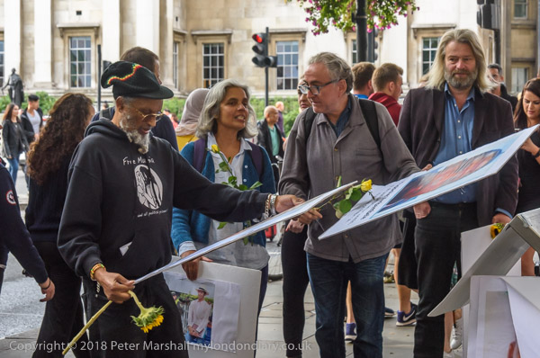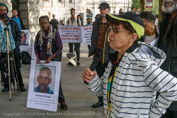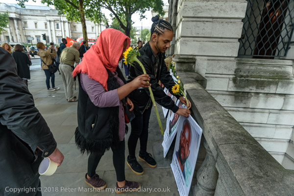 People read the name of one of the murdered strikers then take flower to lay in his memory Flowers and portriats of the murdered miners on the locked gates of South Africa House0 The protest ends