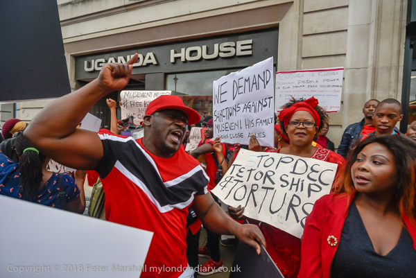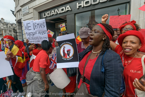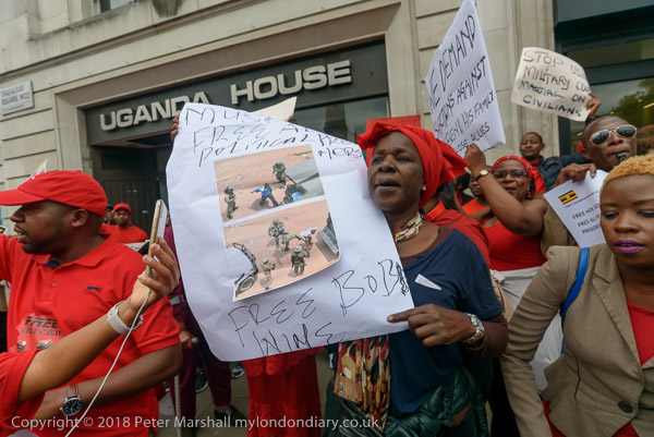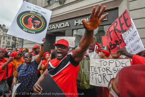 Placards show Bobi Wine in red jacket and hat making a raised fist
