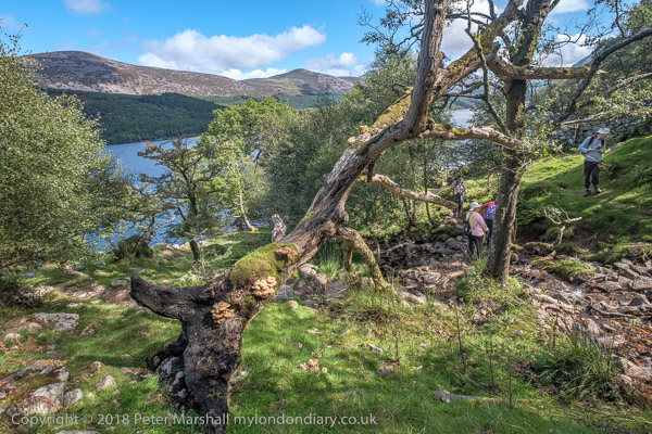 After lunch the rain seemed to be easing a little, and a group of us drove to Fangs Brow for a walk above Lowes Water. We took the path that leads along the hillside at roughly 250-300m on the slopes of Burnbank Fell and Carling Knott, then came down to the lakeside to walk back through Holme Wood and then climb back towards Fangs Brow.