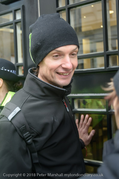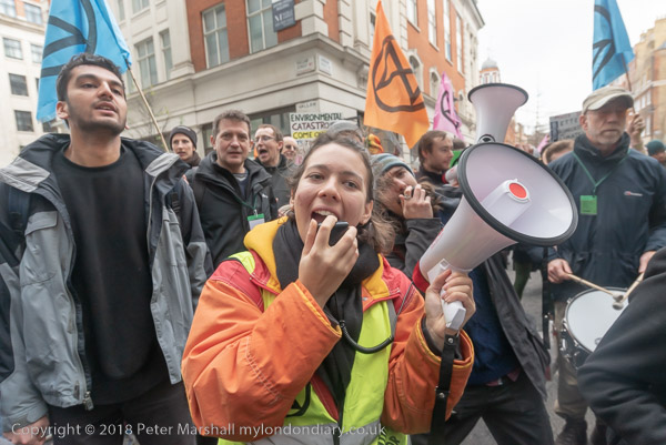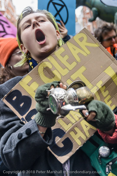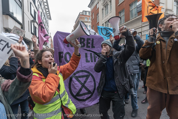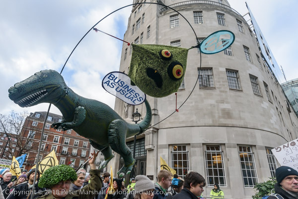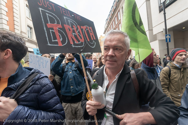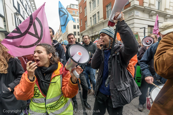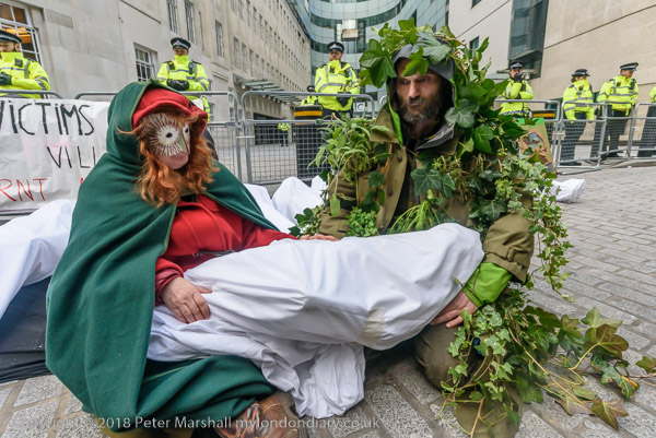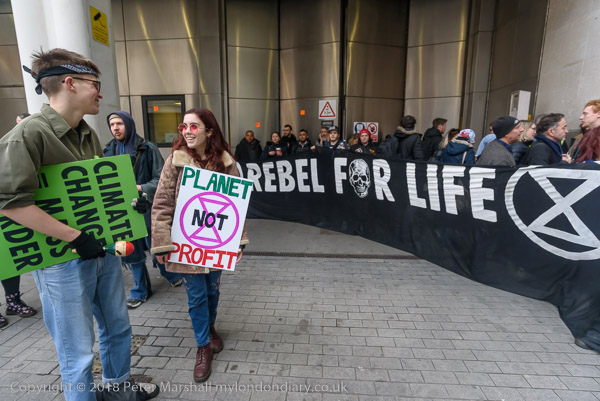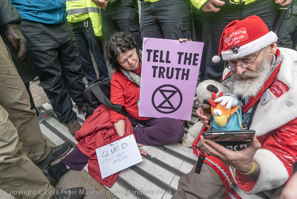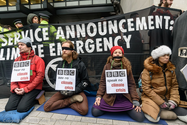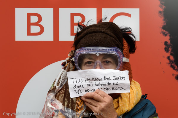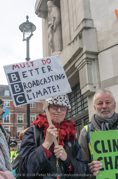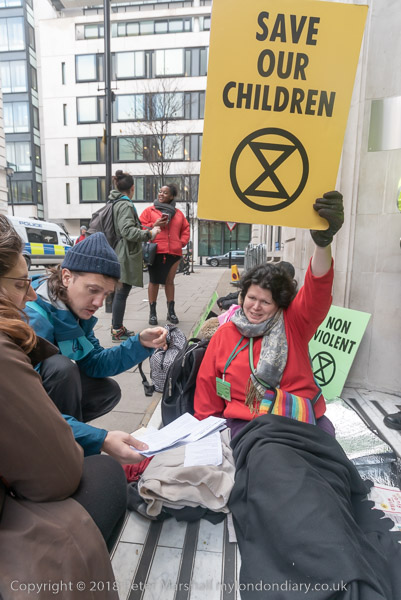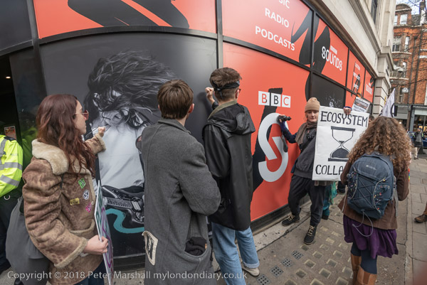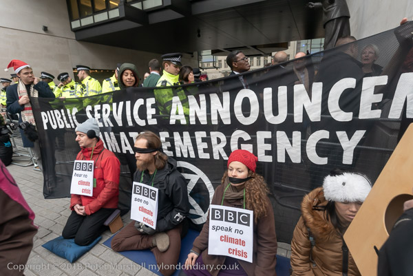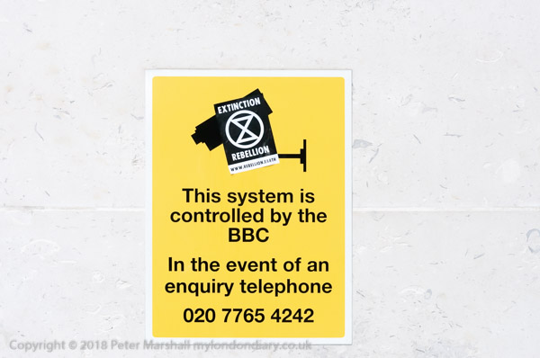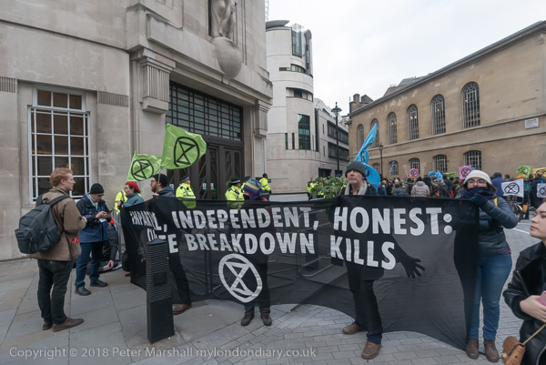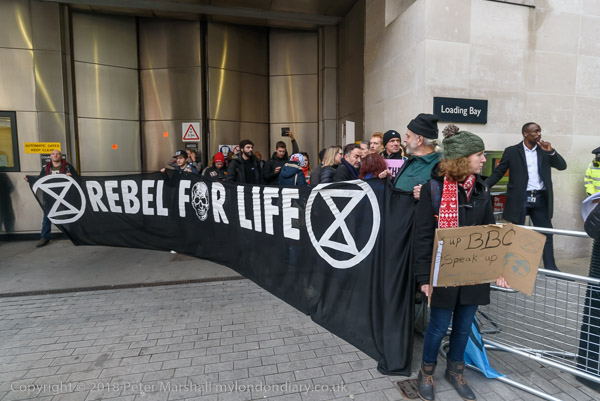 BBC workers coming back from lunch have to squeeze past the XR banner