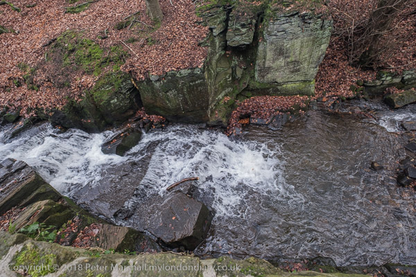 Looking down from the waterfall out of the Lower Pond - my feet at
