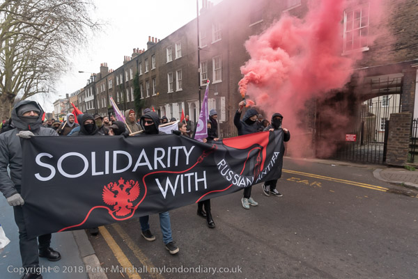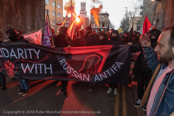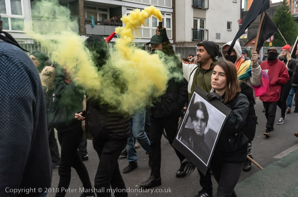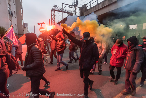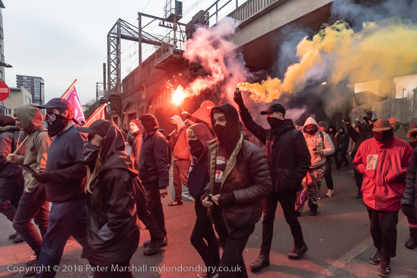 More flares are set off as the march goes under the railway bridge