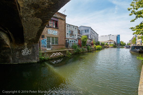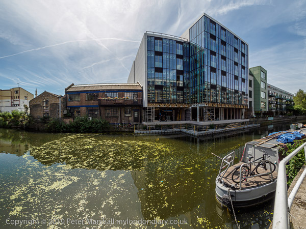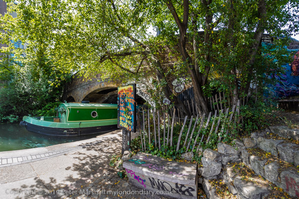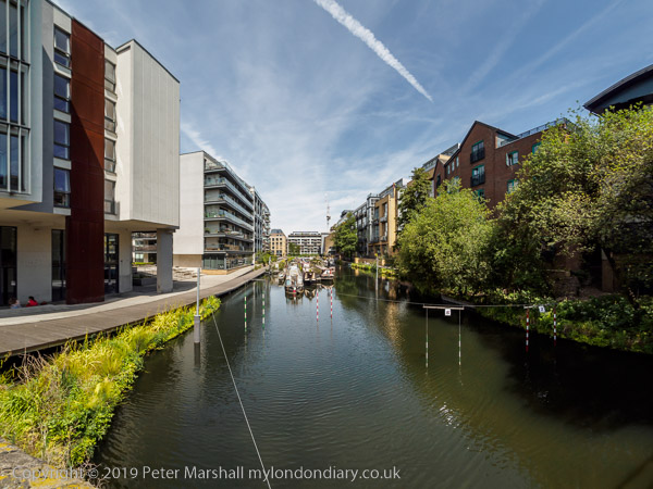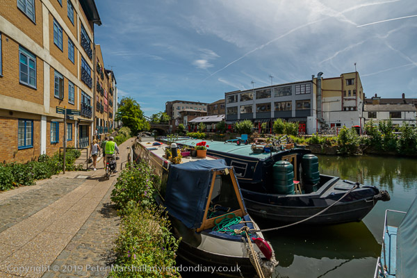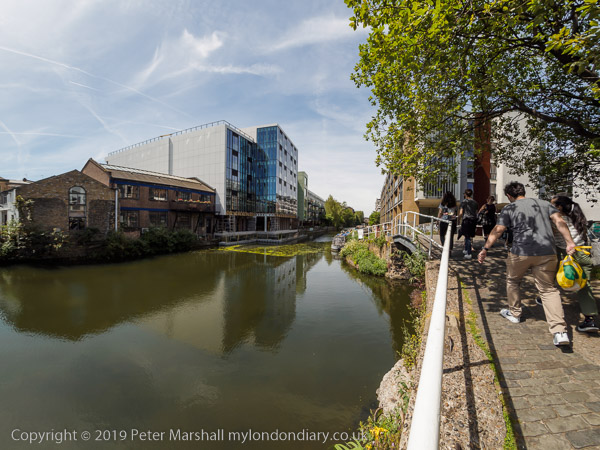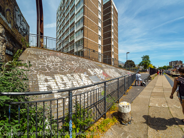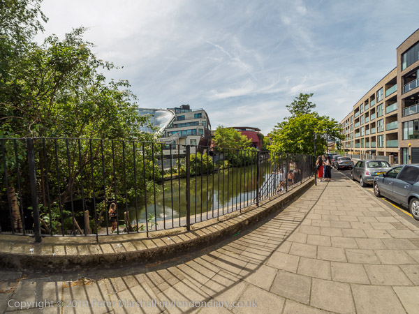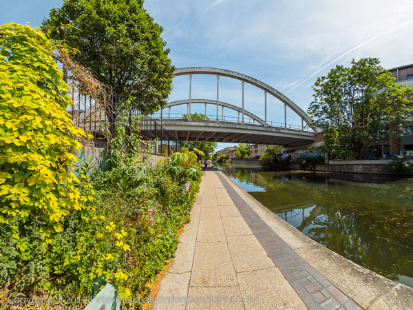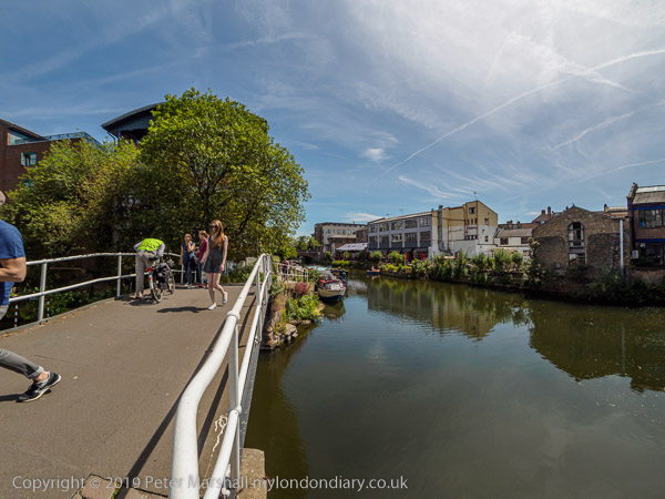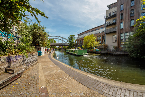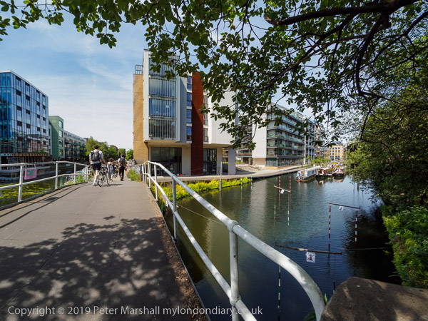 The bridge goes over the entrance to Kingsland Basin - which dates